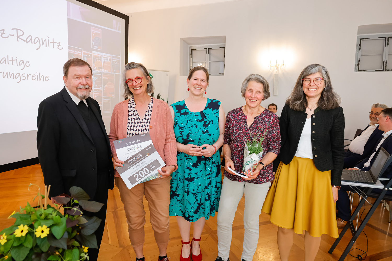 Bereits zum 16. Mal vergab der Arbeitskreis Nachhaltigkeit (AKN) der Katholischen Aktion (KA) den Diözesanen Umweltpreis, der in diesem Jahr unter dem Titel „Achtsamer Umgang mit Ressourcen“ stand. Die Bedeutung der Dankbarkeit gegenüber Gott und der Schöpfung strich Generalvikar Erich Linhardt in seinem Grußwort hervor. Er überreichte die Preise gemeinsam mit der Umweltbeauftragten Eva Heidlmair sowie mit Andreas Gjecaj, Präsident der KA-Steiermark, Martin Halmer, Ökonom der Diözese sowie Anna Kirchengast, Vorstandsmitglied des AKN. Anna Kirchengast stellte in ihrem Grußwort Bezüge zur vor 10 Jahren erschienen Enzyklika Laudato si‘, zur kürzlich durchgeführten Diözesankonferenz und den eingereichten Projekten her – sie alle sind Hoffnungszeichen für eine gute Zukunft.