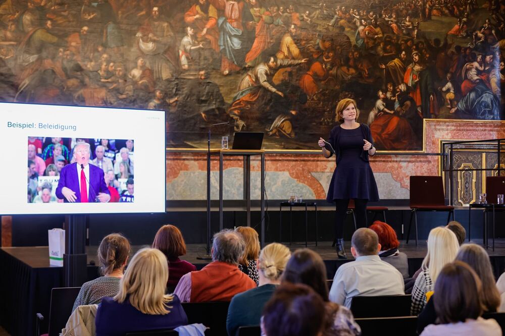 Anschaulichst, mit zahlreichen alltagspolitischen Beispielen, ging Brodnig schließlich auf die „Taktiken der Meister der Beleidigungen“ ein, deren „Methoden der Eskalation“ nichts anderes als „die Zerstörung öffentlicher Debatten“ anvisierten. Als notwendigen Gegenpol packte Brodnig ihr hilfreiches Rüstzeug aus, um der Härte von Fake News und Emotionalisierung beizukommen: Strategien wie die Entwicklung von Reflexionsfähigkeit und Achtsamkeit sich selbst und dem/der Anderen gegenüber sowie praktische Tipps wie Faktenchecks, um Eskalationsmuster zu erkennen und mit Klarheit darauf reagieren können.