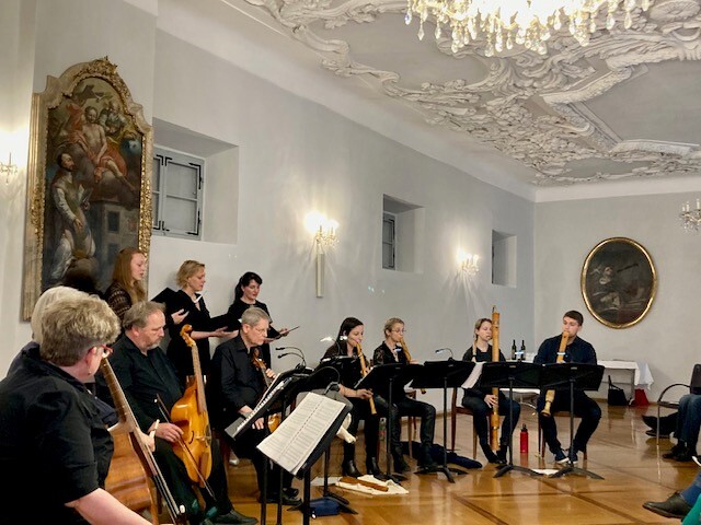 Umrahmt und thematisch gestützt wurde die Lesung durch das St.-Thomas-Consort des Johann-Joseph-Fux-Konservatoriums (Fachbereichs ,Alte Musik‘, Leitung: Claire Pottinger-Schmidt), das Auszüge aus seinem Konzertprogramm ,Da pacem‘ zum Besten gab: Mit Barock- und Renaissanceklängen von Thomas Crécquilon, Cristoforo Caresana sowie Rognoni Taeggio vermittelte das elfköpfige Ensemble die menschliche Trauer um das Verlassensein vom Glück in Kriegszeiten sowie die zeitunabhängig Botschaft vom notwendigen Frieden.