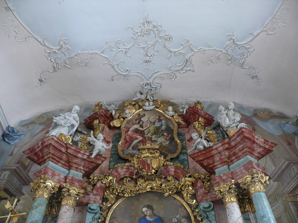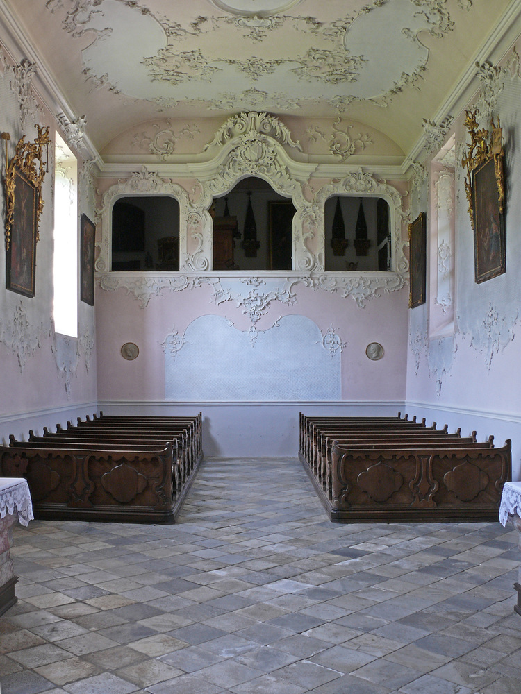 Schlosskirche WaldsteinJohann Seyfried von Eggenberg ließ die Kirche zwischen 1667 und 1713 als Südflügel des Schlosses Waldstein erbauen.  Im 18. Jh. erhielt die Kirche unter den neuen Besitzern, den Grafen von Dietrichstein,  eine reiche Innenausstattung im spätbarocken Stil.