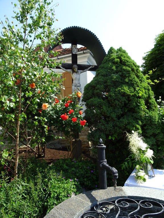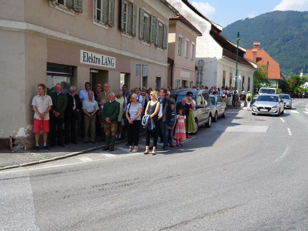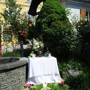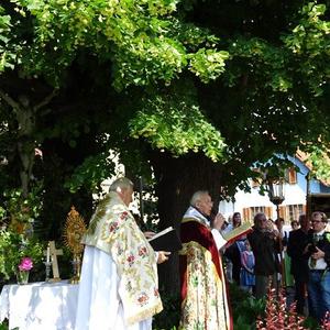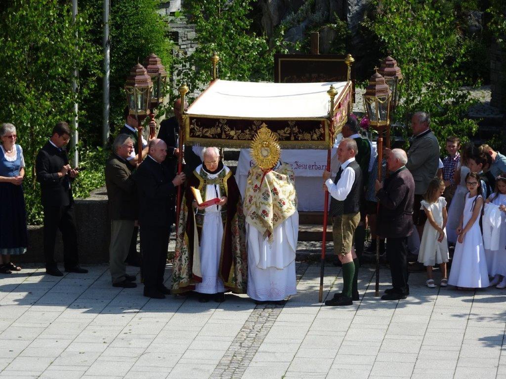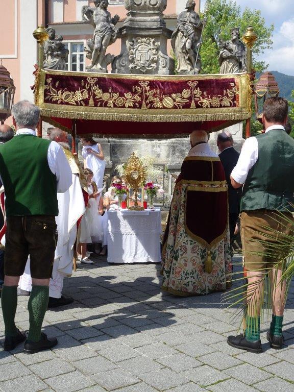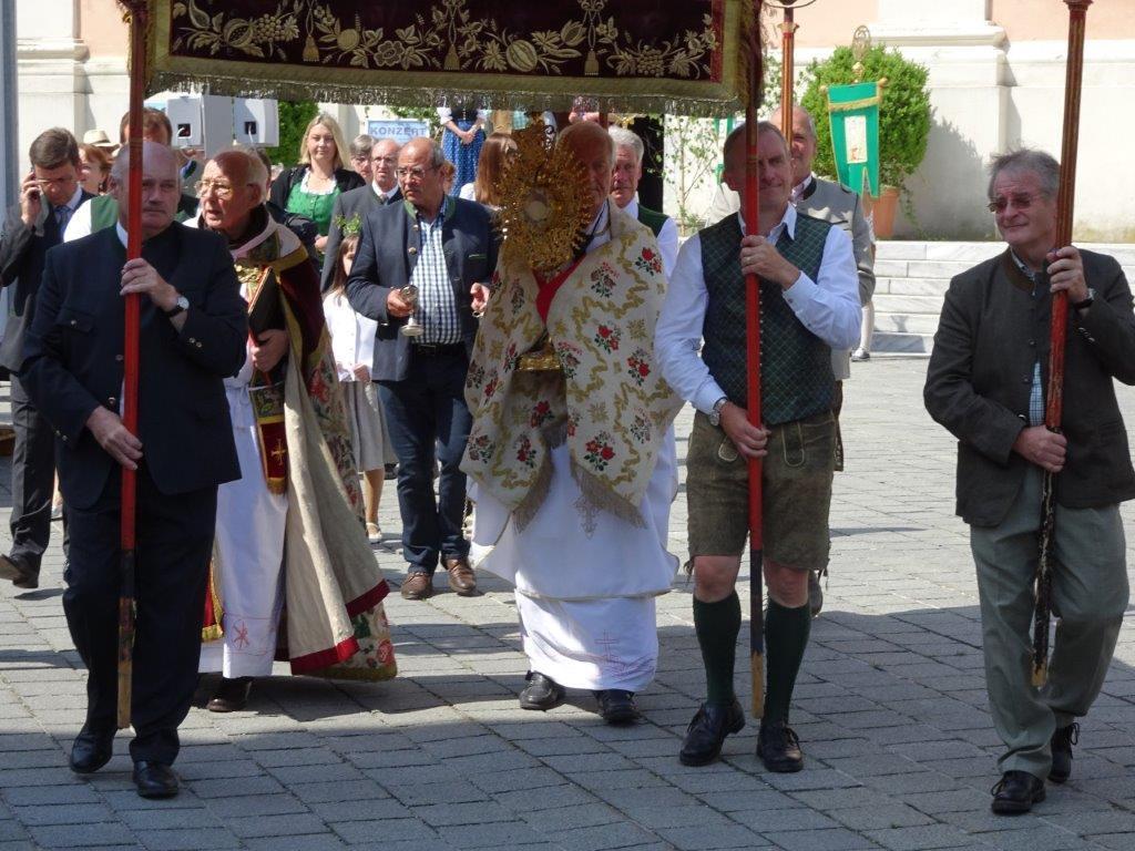Am Beginn des Fronleichnamsfestes, dem "Hochfest des Leibes und Blutes Christi" stand ein festlicher Gottesdienst in der Pfarrkirche, zelebriert von Franziskanerpater Bernardin Schröder und  Pater Simon. Hernach folgte die feierliche Prozession mit einer Monstranz (Gefäß, in dem eine Hostie für den Leib Christi aufbewahrt ist) unter einem Baldachin zu den Stationen mit den liebevoll geschmückten 4 Altären im Römerpark, Vormarkt (Missionskreuz), am Taboraufgang und bei der Mariensäule am Hauptplatz, wo jeweils die Evangelien gelesen und der eucharistische Segen erteilt wurde.