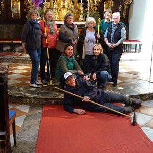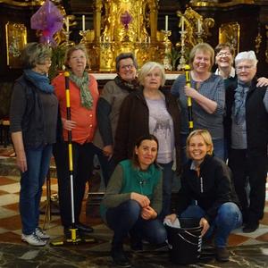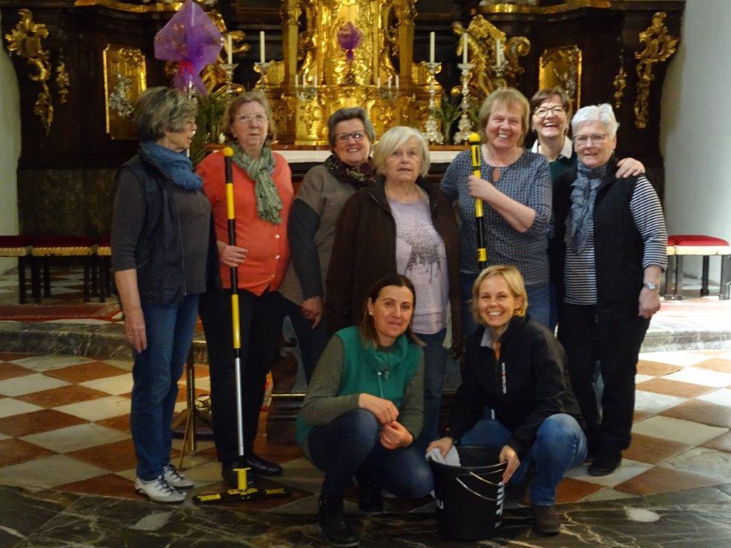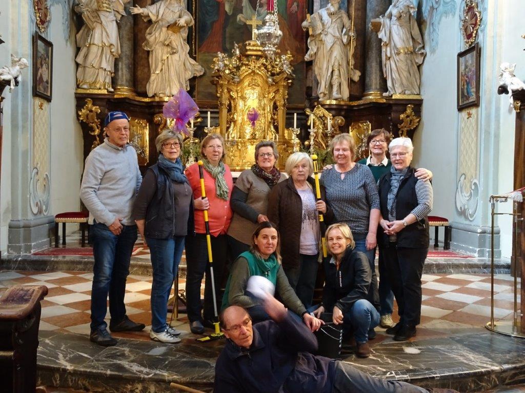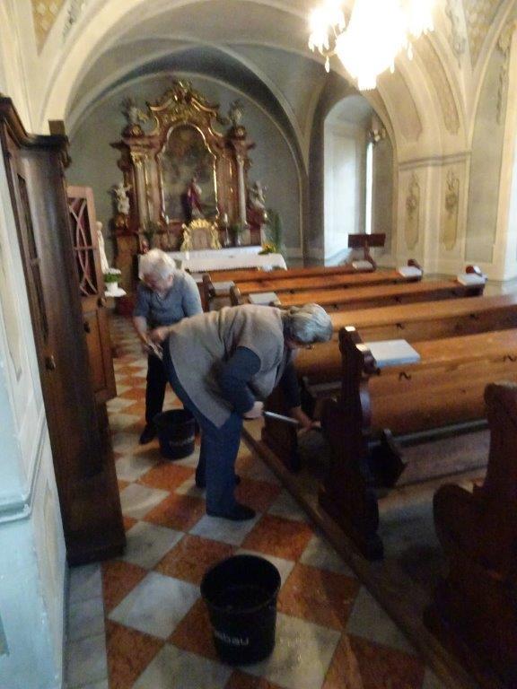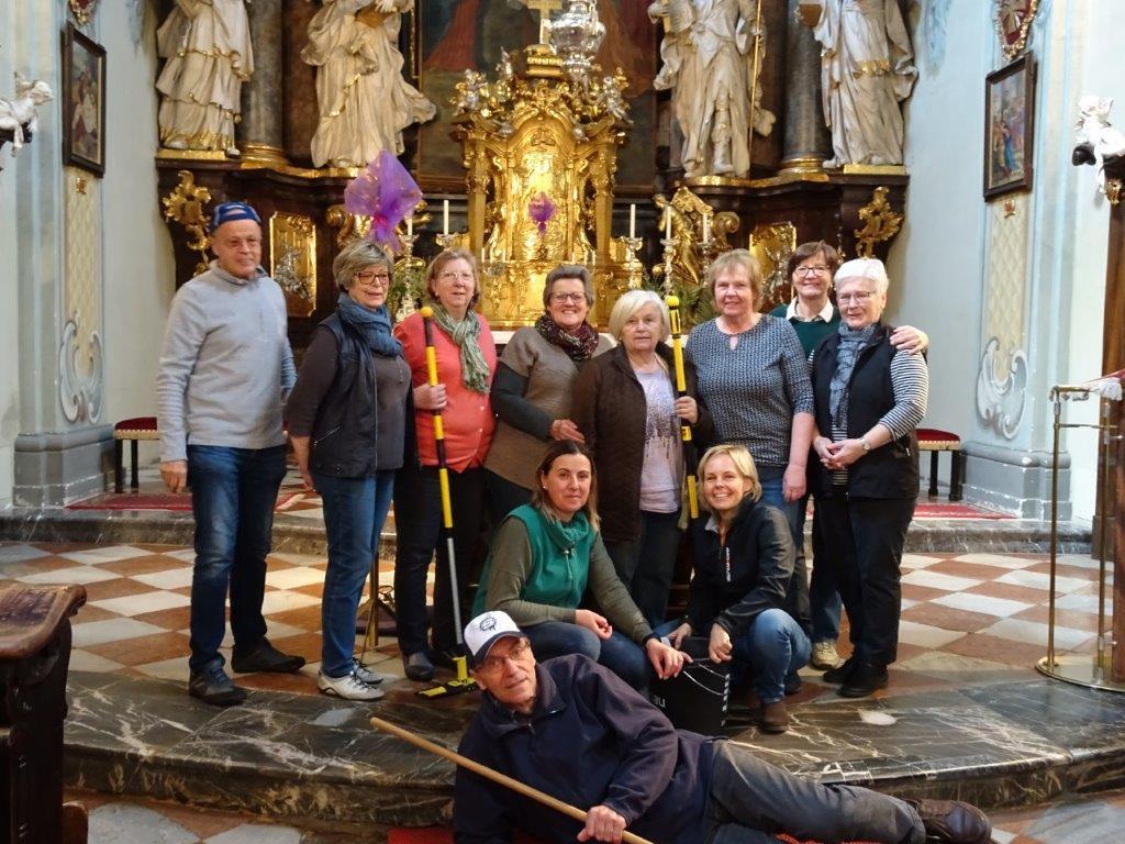 Um 8 Uhr früh kam ein Bus der Firma Eibisberger GmbH, beladen mit zwei Hochdruckstaubsaugern, vielen Putzlappen und Kübeln, am Kirchplatz vorgefahren, um unsere Pfarrkirche wiederum auf Hochglanz zu bringen. Die Seniorchefin Heidi Eibisberger organisierte acht fröhliche Frauen und zwei männliche Wasserträger um dies zu bewerkstelligen. Es wurde nicht nur der Innenraum der Pfarrkirche gereinigt, sondern auch alle Altäre und Stühle, die Siebenväterkapelle, der Kreuzgang, alle Stiegen und Fenstern, der Eingang und die äußeren Stufen.