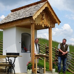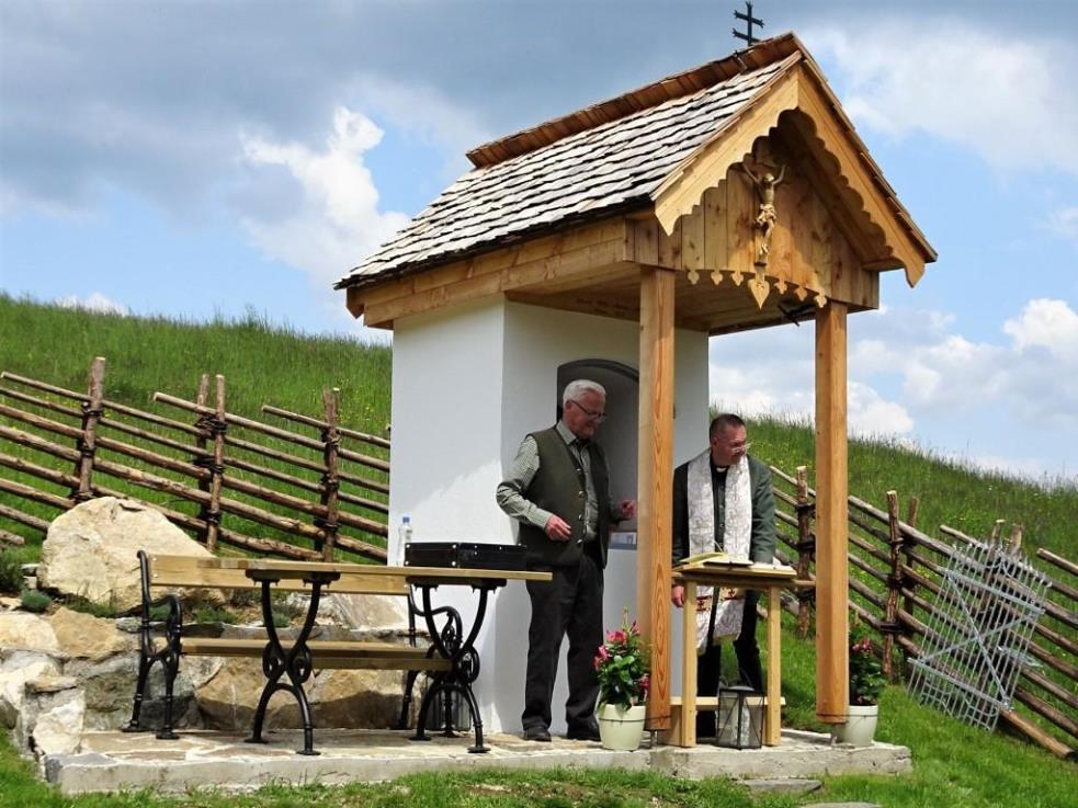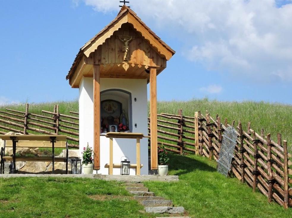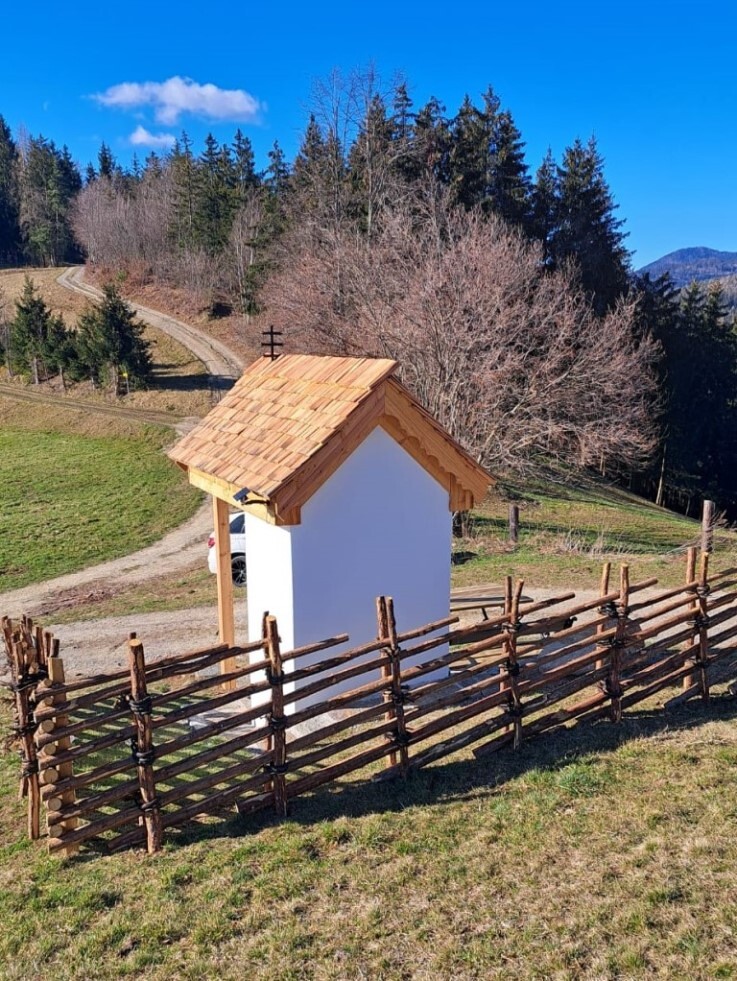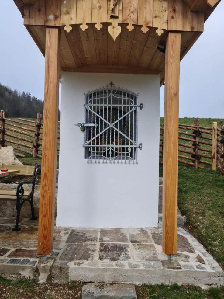 Das morsche Holzvordach wurde durch eine gefällige Lärchenholzstruktur ersetzt. Das Dach wurde mit neuen Holzschindeln gedeckt und das Wetterkreuz wiederum am First befestigt. Ein einzigartiges Novum ist die Installierung einer Solarbeleuchtung für die Nacht.