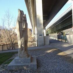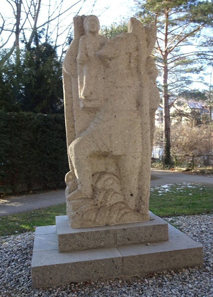 Die zweite künstlerische Darstellung der Christophorus-Statue musste ihren ursprünglichen Platz wechseln. Diese war gut sichtbar auf einem Pfeiler an der Brückenauffahrt platziert, um symbolisch über die Passanten zu wachen und musste dem Bau der neuen Betonbrücke Anfang der 1980er-Jahre weichen. Die gegenständliche Skulptur wurde daraufhin in den Ortsteil Mauritzen ganz in der Nähe der markanten Fußgänger-Hängebrücke am linken Murufer und am Rande des Volkshausparks versetzt. Die aus Sandstein gefertigte Statue ist 2,73 m hoch und steht auf einem massiven Steinsockel (1,41 x 0,81 m). In der Nacht wird die riesige Skulptur beleuchtet.