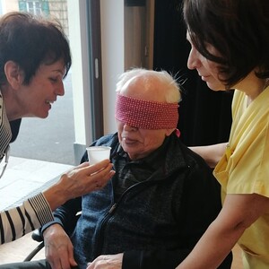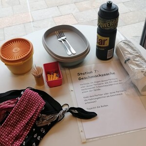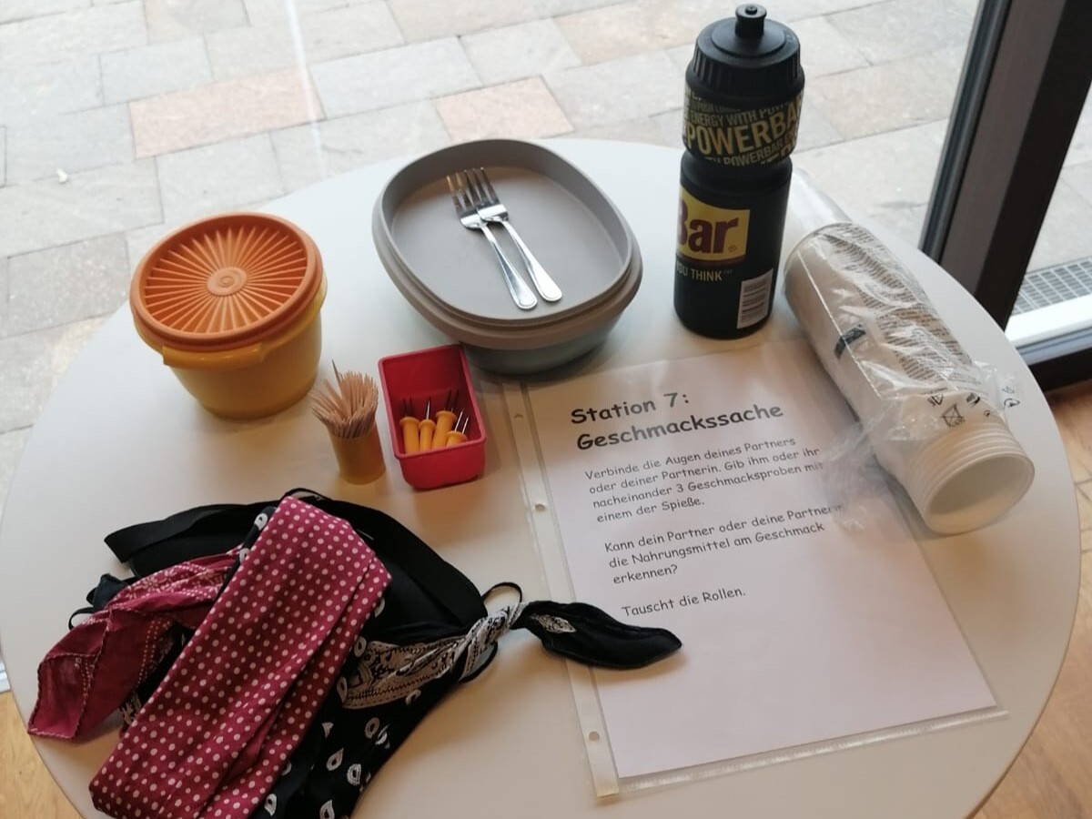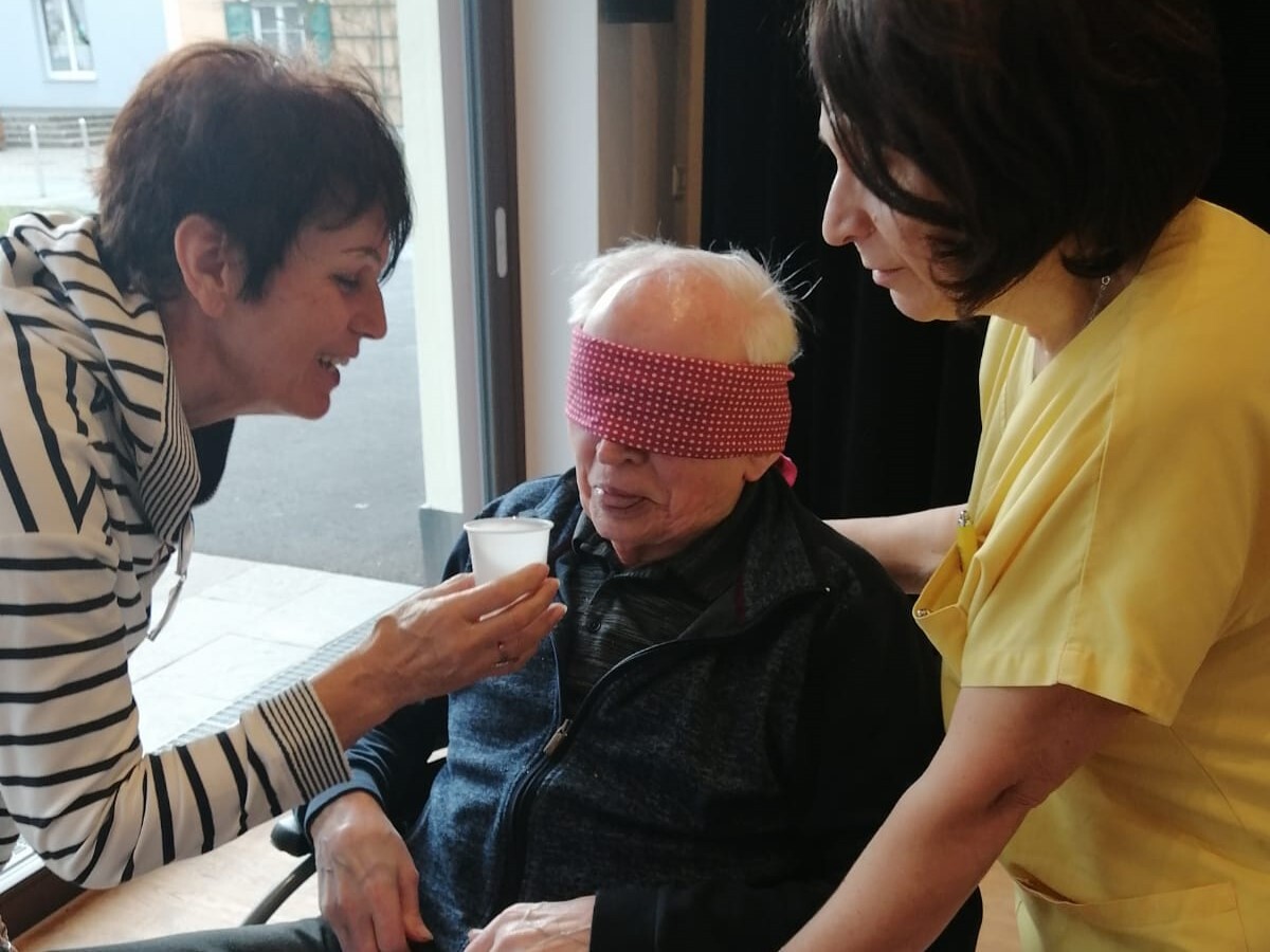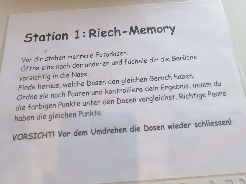 Eine gelungene Idee war der Weg der Sinne, der von Frau Michaela Moser vor­be­rei­tet wurde. Mit Begeisterung waren alle Senioren dabei und ver­such­ten sich im bewussten Wahrnehmen ihrer Sinne. Ob rie­chen, schmecken oder das Gedächtnis ausprobieren, es machte den Teil­neh­men­den großen Spaß.