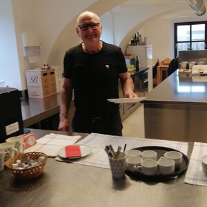 Nach dem besinnlichen Einstieg, der alle sehr berührte, wurde Kaffee und Weiß­brot serviert. In der Runde der Besucher befanden sich zwei Ge­burts­tags­kin­der denen herzlich gratuliert wurde. Mit einem Gläs­chen Wein wurde auf das Wohl von Herrn Resch und Frau Elsnig angestoßen.