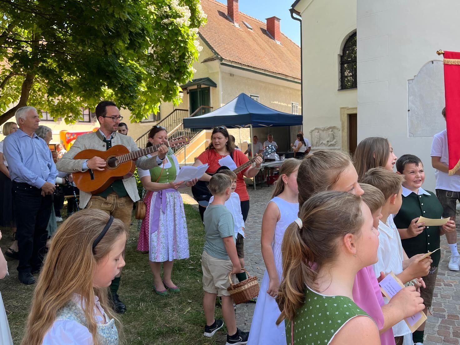 Danke auch allen Eltern für den wun­der­schö­nen Blu­men­tep­pich vor der Kir­che und die Be­glei­tung der Kin­der zu die­sem Hoch­fest.
