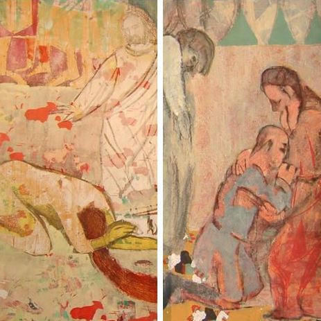 Die beiden Seitenwände zieren zwei Fresken, links ein breites Band von der Rückseite bis zum linken Fenster nach vorne mit der Darstellung der Hochzeit zu Kana und auf der rechten Wandfläche die Darstellung, wie der barmherzige Samariter dem unter die Räuber gefallenen Juden zu Hilfe kommt. Inhaltlich ist die Parabel vom barmherzigen Samariter unter dem Blickwinkel der Barmherzigkeit leicht einzuordnen, doch schwieriger ist es mit der Hochzeit von Kana. Dort hat Jesus nach Johannes in erster Linie ein Zeichen seiner Sendung für die Jünger gesetzt. Dem Weinwunder an sich kommt eher nachrangige Bedeutung zu. Ohne auf eine Wertung der künstlerischen Darstellung eingehen zu wollen, muss angemerkt werden, dass es zumindest einer „Gewöhnungsphase" bedarf, bis sich die Botschaft der bildlichen Ausgestaltung dem Betrachter erschließt.