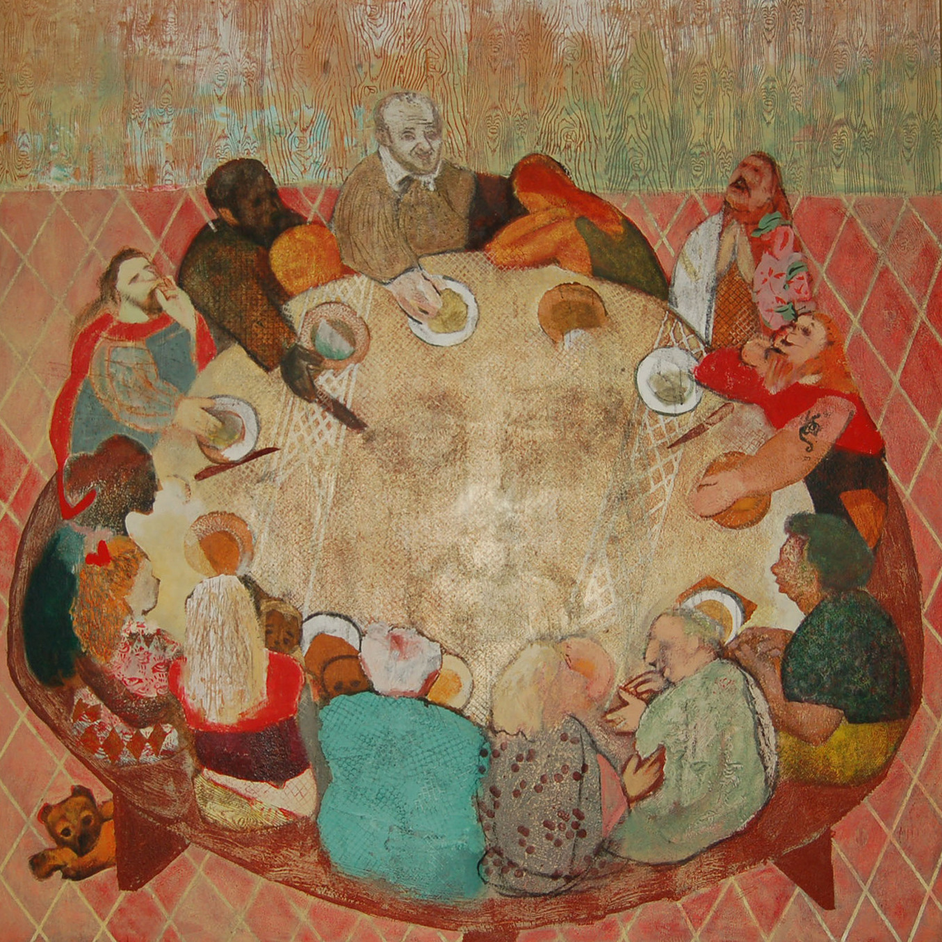 Mitten unter den Armen sitzt Vinzenz von Paul. Er trägt keinen Heiligenschein, steht auch nicht als großer Helfer über ihnen, sondern gehört zu ihnen. Es ist, als wären die Leute gerade hereingekommen, als Vinzenz sich zu Tisch setzen wollte, um sein einfaches Mahl zu sich zu nehmen. Nun teilt er es mit ihnen. Sind das wirklich Arme? Wer weiß schon, wer wirklich arm ist? Hier sitzen alte Leute, dazwischen Kinder mit tiefliegenden Augen, ein Haftentlassener mit seiner Tätowierung, ein leichtes Mädchen, das wie Johannes beim letzten Abendmahl in besonders liebevoller Nähe zu Vinzenz sitzt, ein Sandler zu seiner Rechten und Menschen aus fremden Ländern, Asylanten. Ihre Gesichter sind nicht sehr deutlich.Vinzenz sagt: „Oft genug haben die Armen überhaupt kein Gesicht, aber drehen Sie die Medaille um, dann werden Sie im Lichte des Glaubens sehen, dass der Sohn Gottes uns in diesen Armen begegnet." Das in der Tischmitte durchscheinende Antlitz Christi lässt die Gegenwart des leidenden Christus in diesen Menschen ahnen. Darum fordert Vinzenz: „Dienen wir den Armen mit neuer Liebe. Erkennen wir vor Gott, dass sie unsere Herren und Meister sind!" Armendienst ist Gottesdienst! Die Zwölf, die um Christi Antlitz bei der Armensuppe sitzen, erinnern an das Abendmahl, das Mahl der Liebe Gottes, dessen innerstes Geheimnis nach Vinzenz das „Erbarmen" ist.