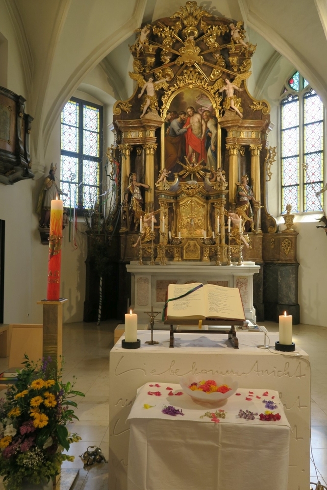 Diese Botschaft symbolisiert - über die österliche Auferstehungsfeier hinaus - die wunderschöne Osterkerze, gestaltet von Maria und Martin Kirchberger.