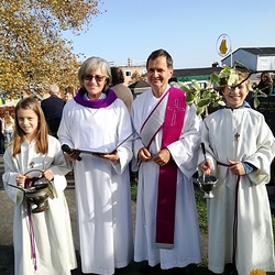 Mit dem Begrüßungssatz „Heute gießt der liebe Gott die Blumen!“, zauberte Vikar Gerhard Hatzmann – in Anspielung auf das Regenwetter – allen großen und kleinen Menschen in unserer Pfarrkirche ganz schnell ein Lächeln ins Gesicht. Eine wunderbare, fröhliche Erntedankfeier folgte.
