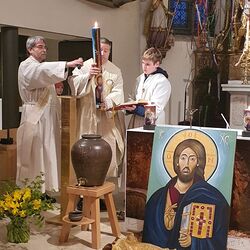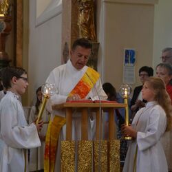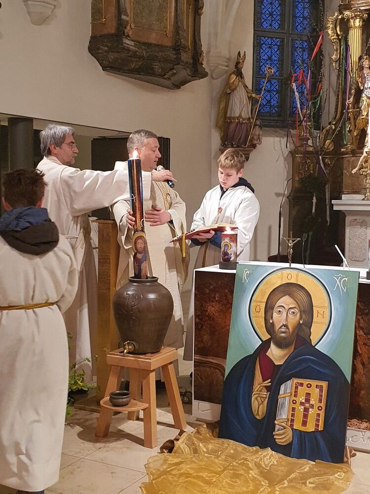 Danach entzündeten die Taufpaten die Taufkerzen der Kinder an der Osterkerze und erneuerten ihr Patenamt vor ihren Schützlingen.