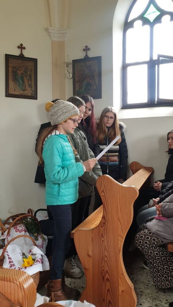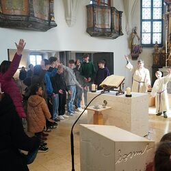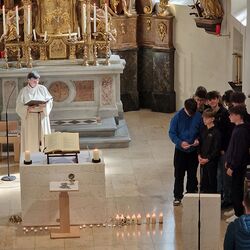 Im Anschluss an die Workshops feierte Vikar Mag. Hatzmann mit uns die Heilige Messe. Nach dem Hören der Heiligen Schrift besprachen wir die Symbole Brot und Hand.