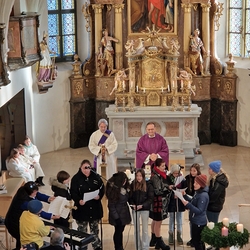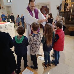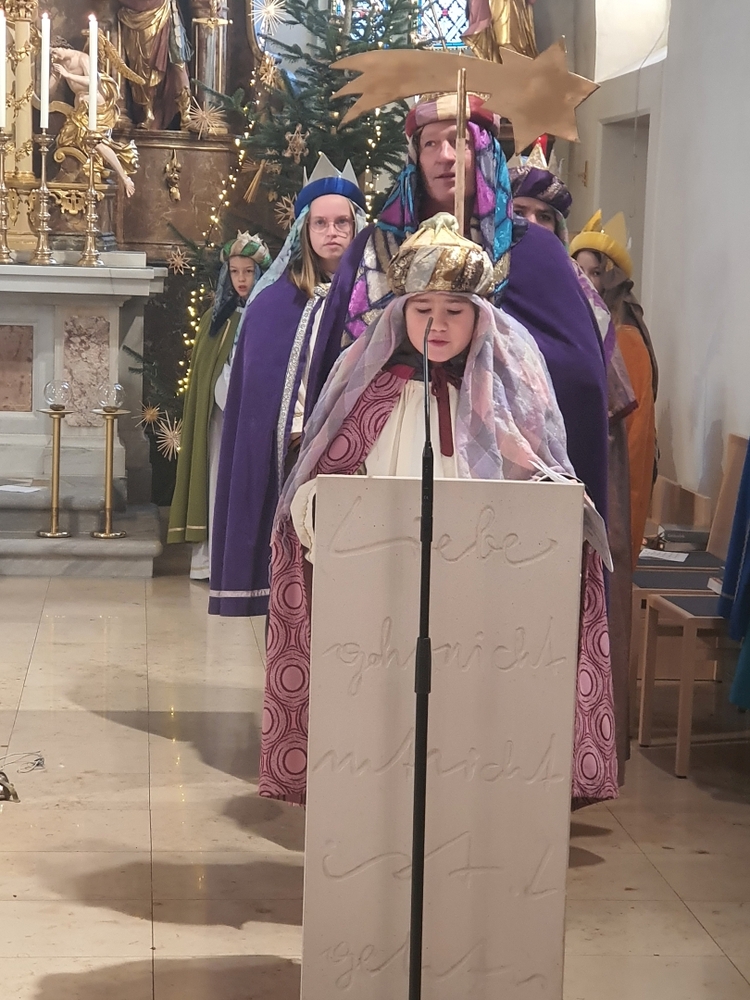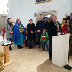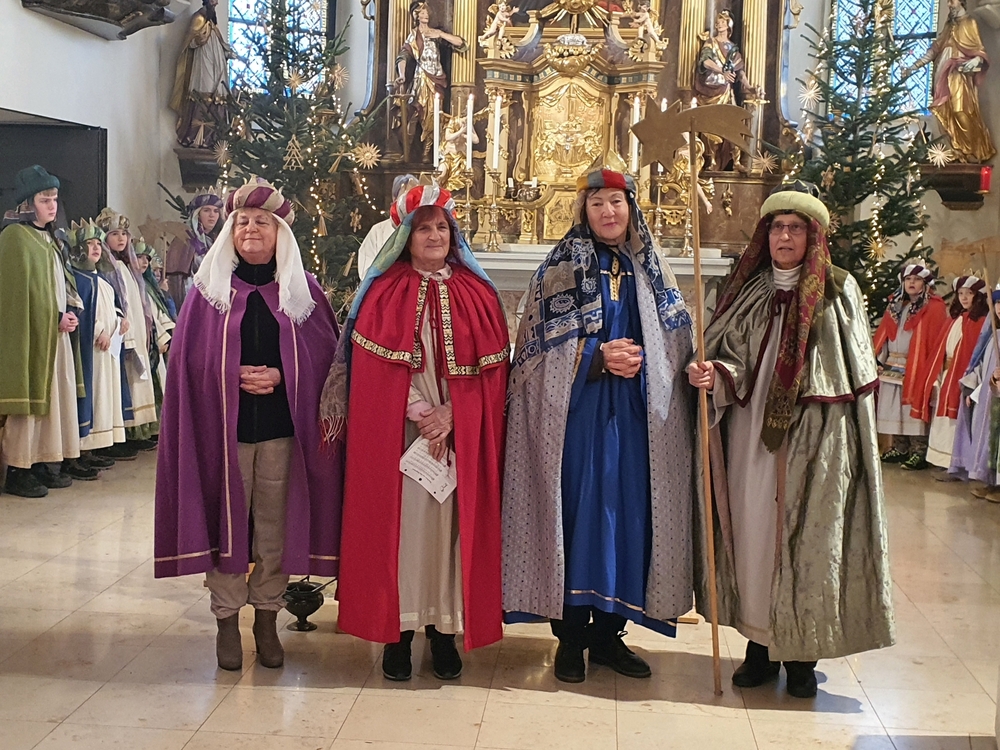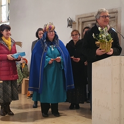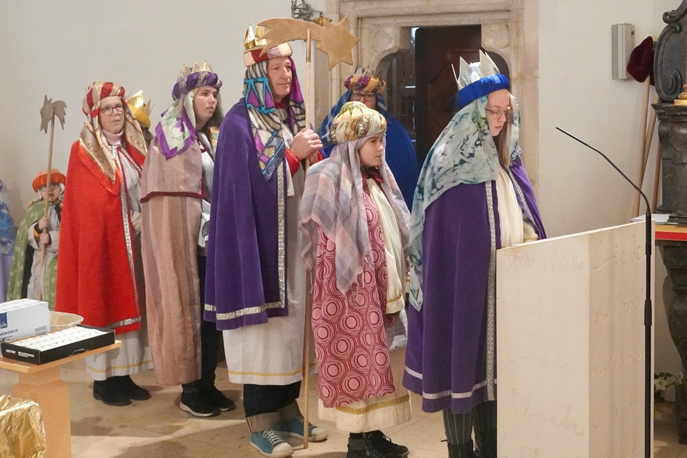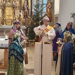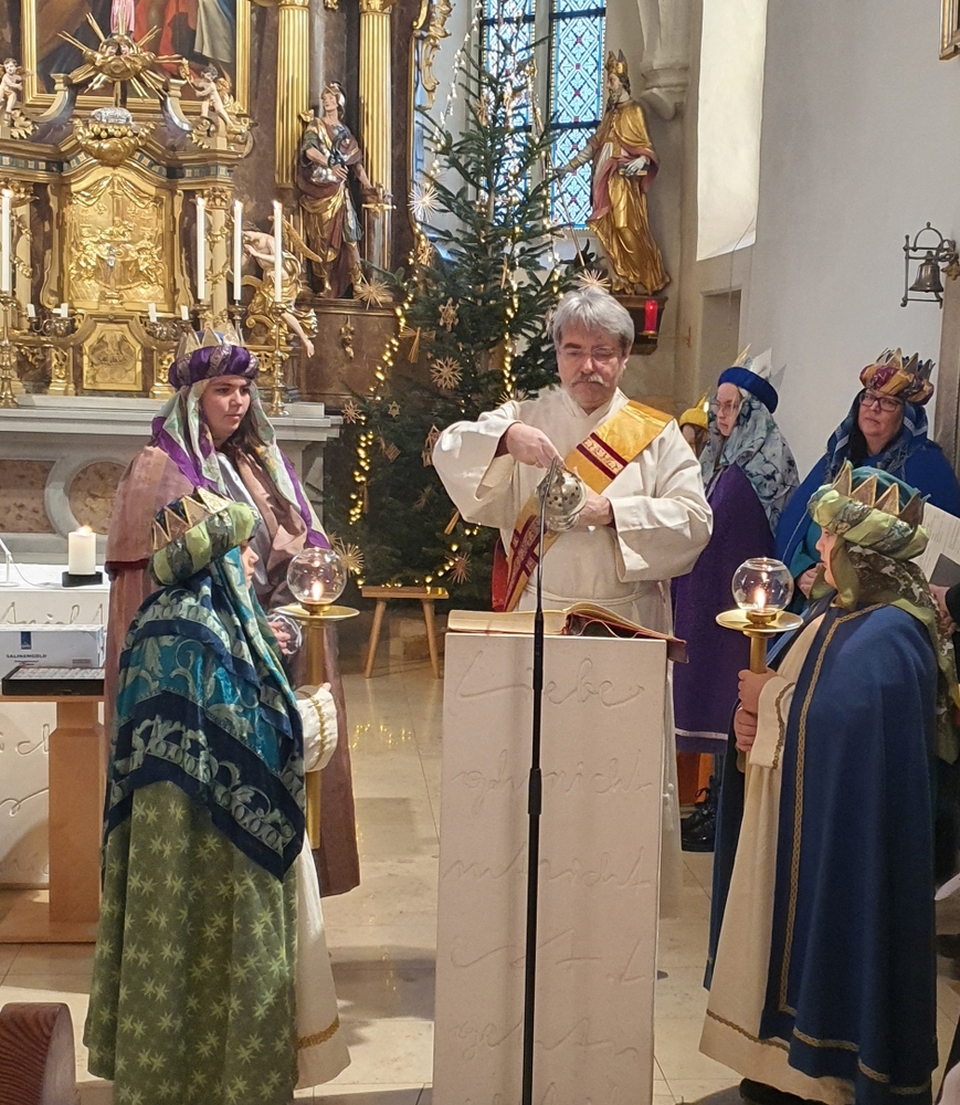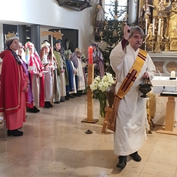 Mit einem königlichen Einzug begann der Sternsingergottesdienst am Dreikönigstag. Diakon Michi Zepf zelebrierte die Wort-Gottes-Feier mit Kommunionspendung zum „Hochfest der Erscheinung des Herrn“. In vielen Texten und Liedern kam das Anliegen der Dreikönigsaktion zum Ausdruck. Noch einmal trat eine Sternsingergruppe auf und präsentierte ihre Botschaft. Die Segnung des Dreikönigswassers und des Salzes, das auch zum Mitnehmen angeboten wurde, bildete zusammen mit der Allerheiligenlitanei, vorgetragen von Martin Kirchberger, den feierlichen Abschluss der WGF.