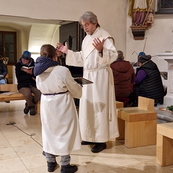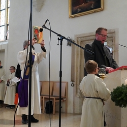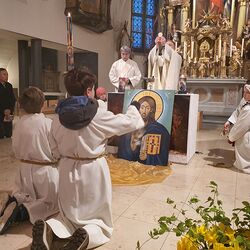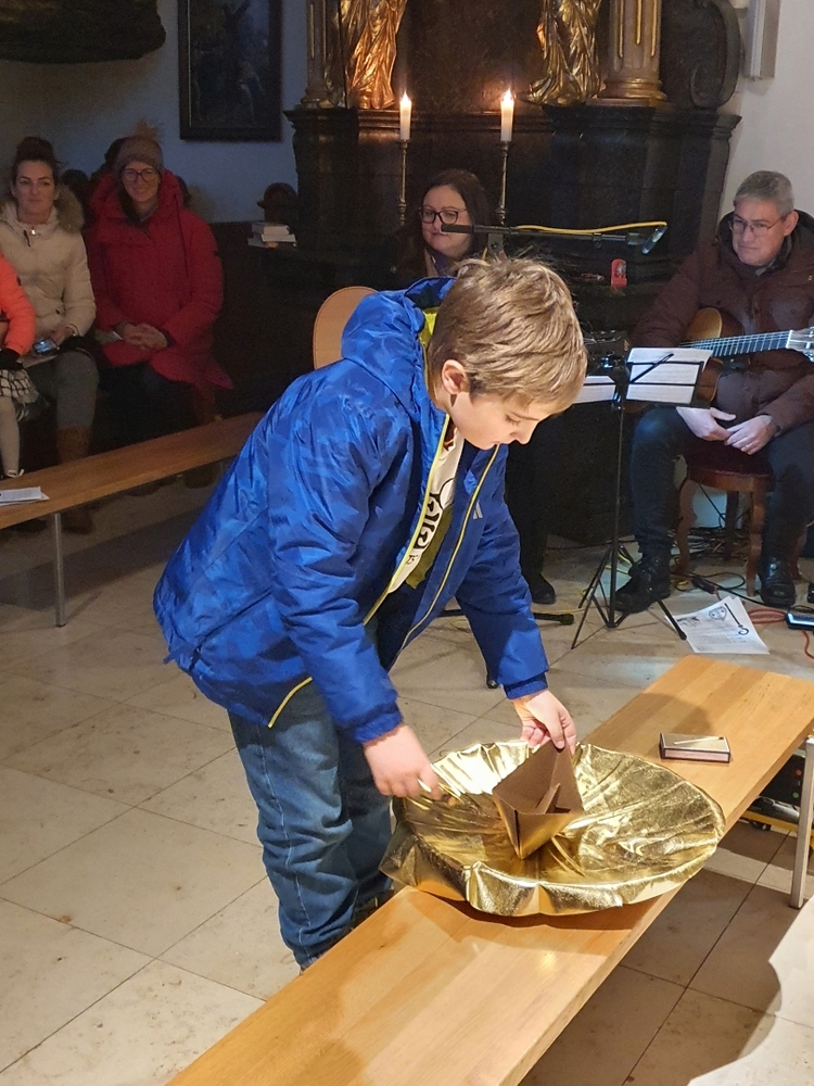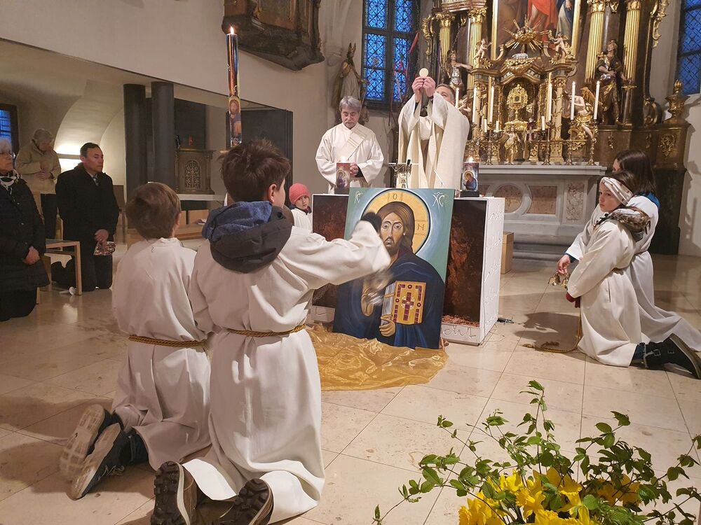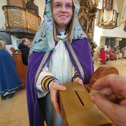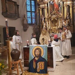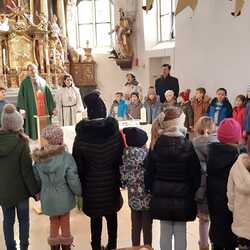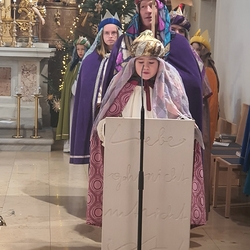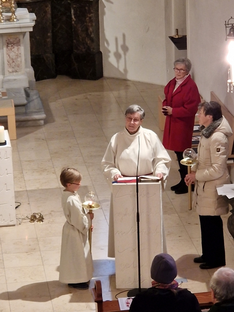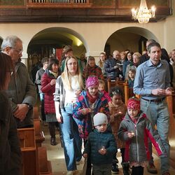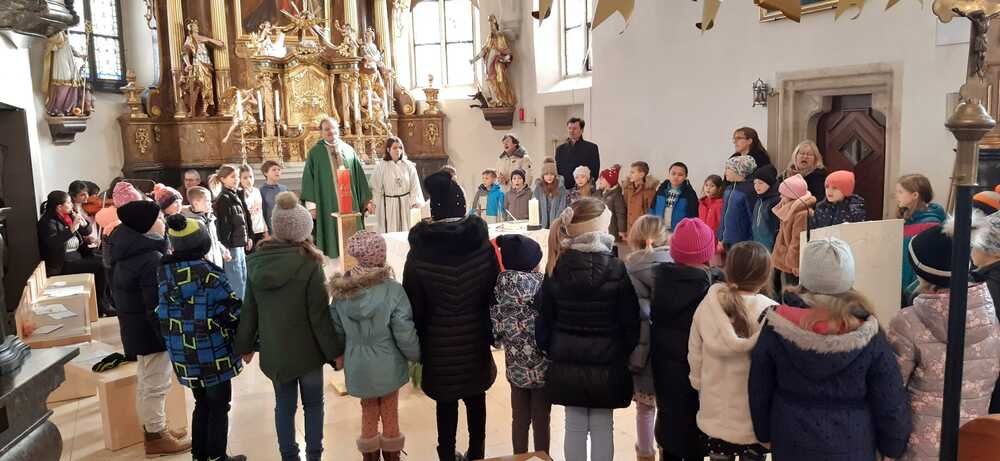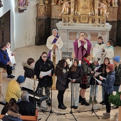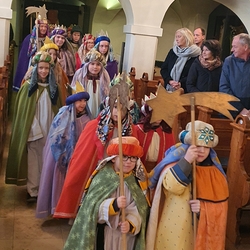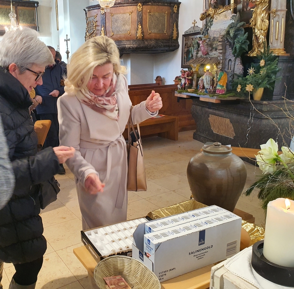 Mit einem königlichen Einzug begann der Sternsingergottesdienst am Dreikönigstag. Diakon Michi Zepf zelebrierte die Wort-Gottes-Feier mit Kommunionspendung zum „Hochfest der Erscheinung des Herrn“. In vielen Texten und Liedern kam das Anliegen der Dreikönigsaktion zum Ausdruck. Noch einmal trat eine Sternsingergruppe auf und präsentierte ihre Botschaft. Die Segnung des Dreikönigswassers und des Salzes, das auch zum Mitnehmen angeboten wurde, bildete zusammen mit der Allerheiligenlitanei, vorgetragen von Martin Kirchberger, den feierlichen Abschluss der WGF.