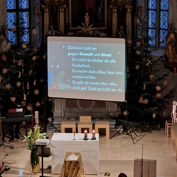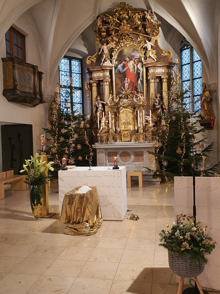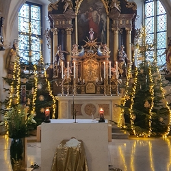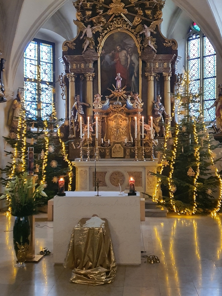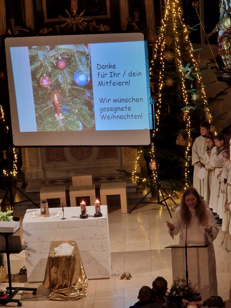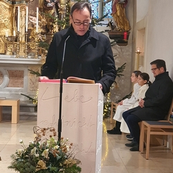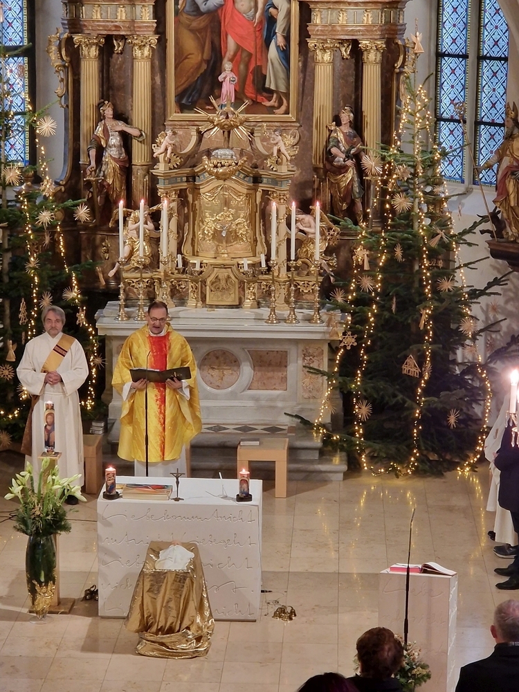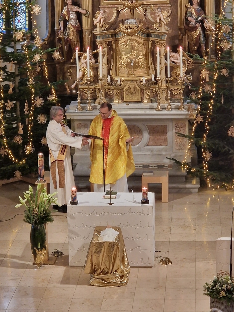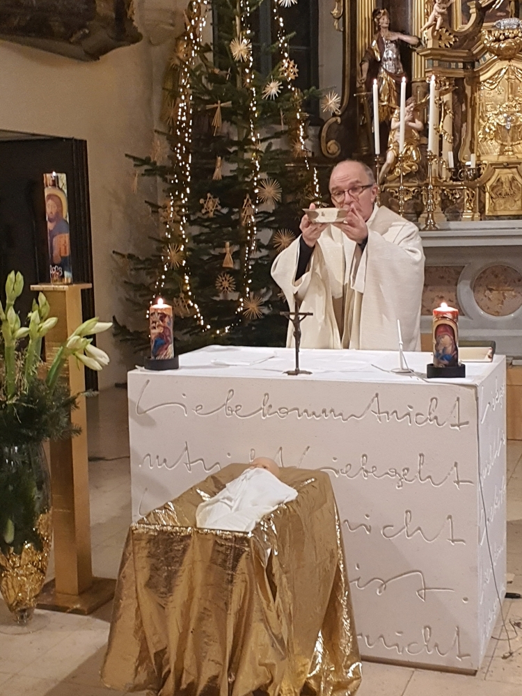 Vikar Norbert Glaser feierte mit vielen Gläubigen die Christmette und wurde von Diakon Michi Zepf unterstützt. Die Freude über die Geburt des Jesukindes, unseres Heilands, stand im Mittelpunkt und fand auch in den vielen schönen Weihnachtsliedern, die gemeinsam gesungen wurden, ihren Ausdruck. Die Friedensbotschaft der Heiligen Nacht möge Kreise ziehen und sich auf unserer Erde ausbreiten!