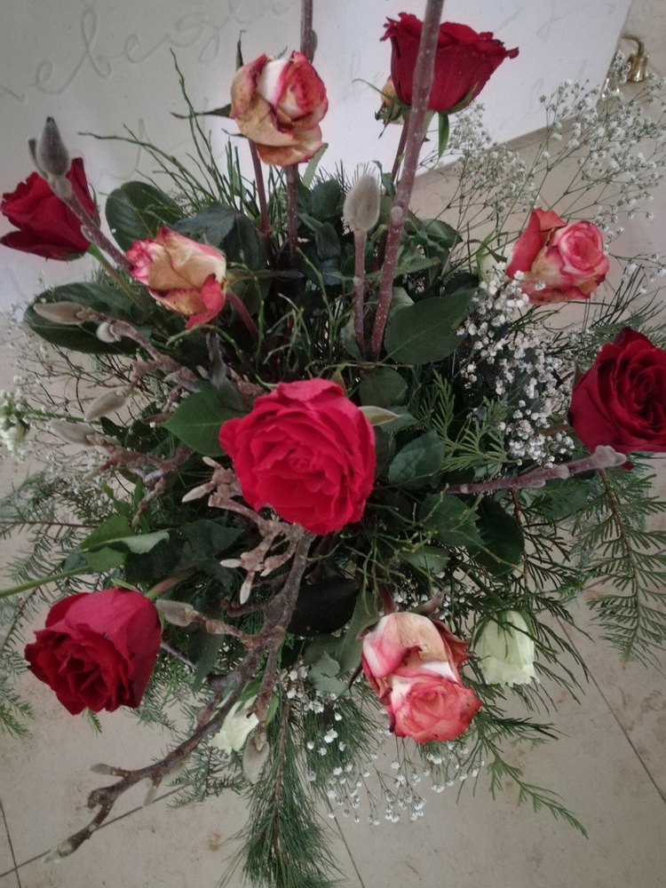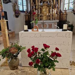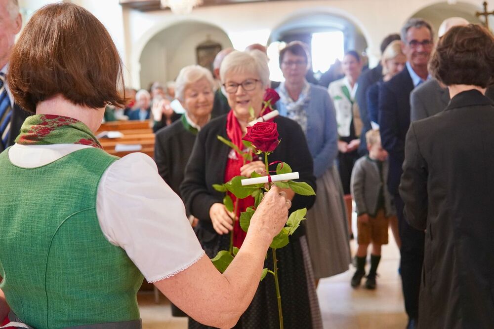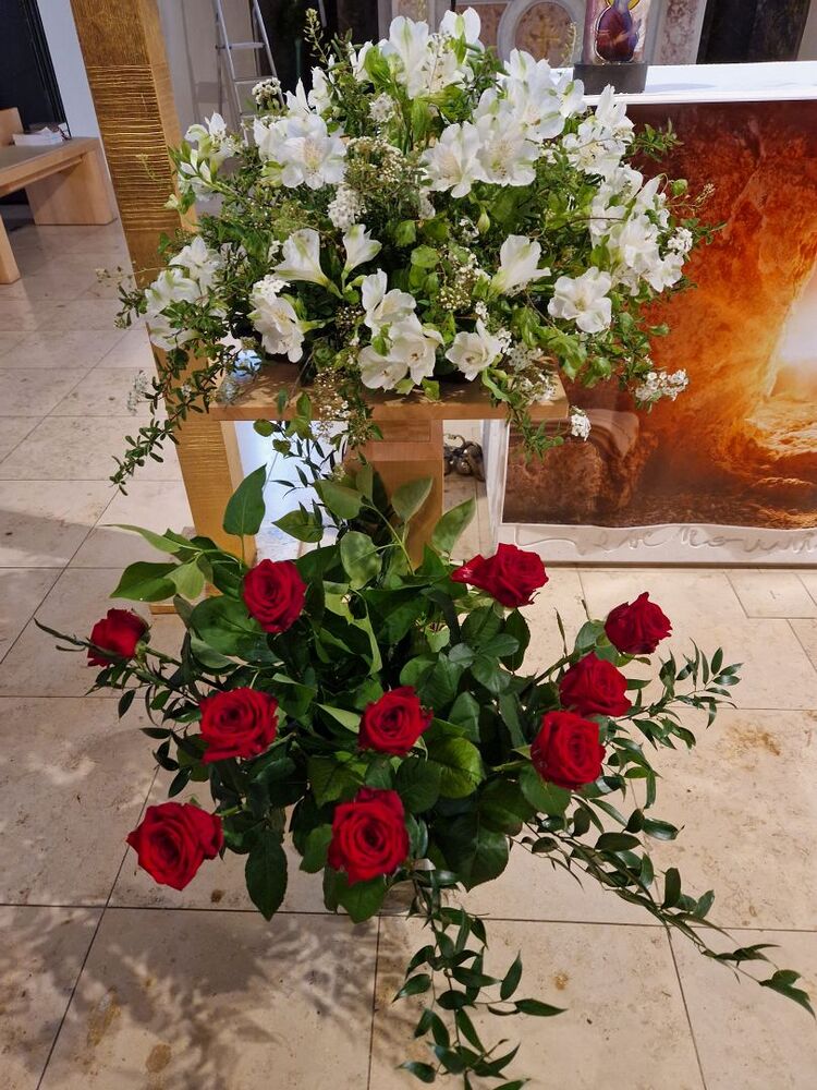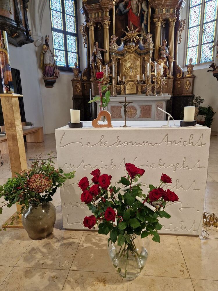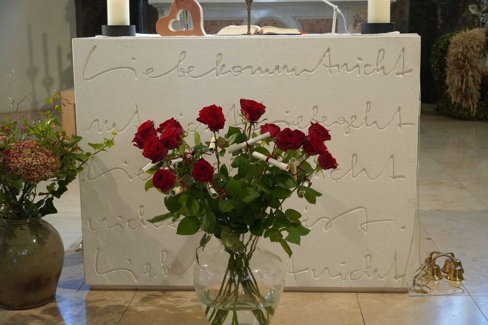 Viele Rosen schmückten die Kirche beim Ehejubiläumsgottesdienst, den wir am 22. Oktober mit Vikar Norbert Glaser feiern durften.