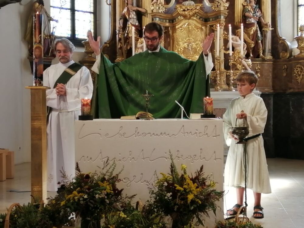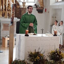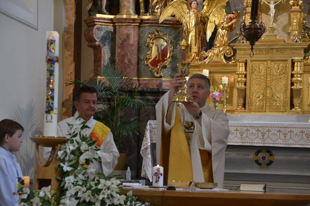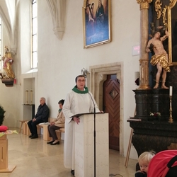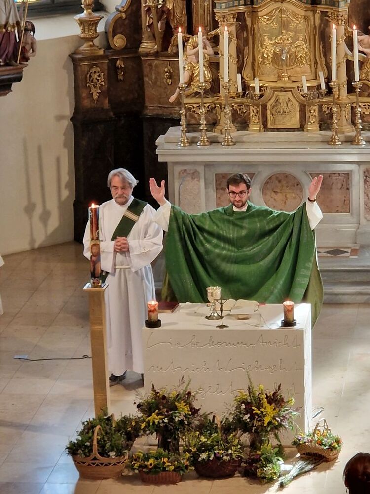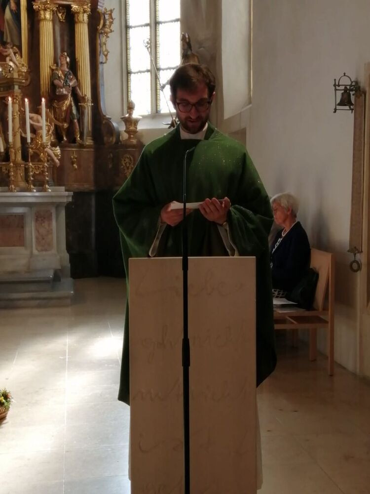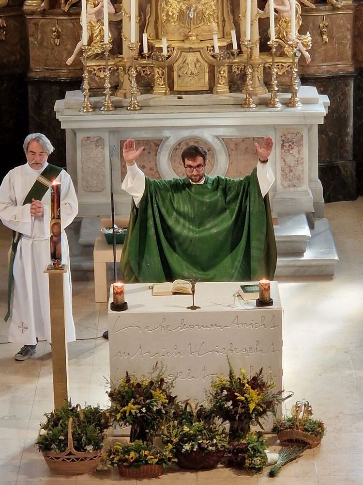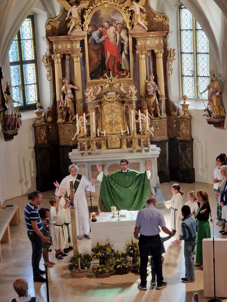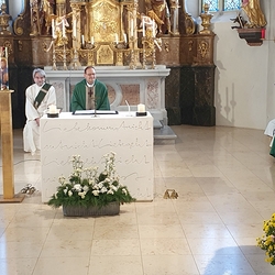 Nach herzlicher Begrüßung durch Diakon Michi Zepf zelebrierte Markus, der ehemals Pastoralpraktikant in unserer Pfarre und Pastoralreferent im Seelsorgeraum Kaiserwald gewesen war, in festlichem Rahmen die heilige Messe.