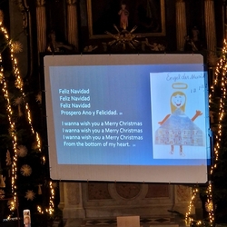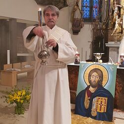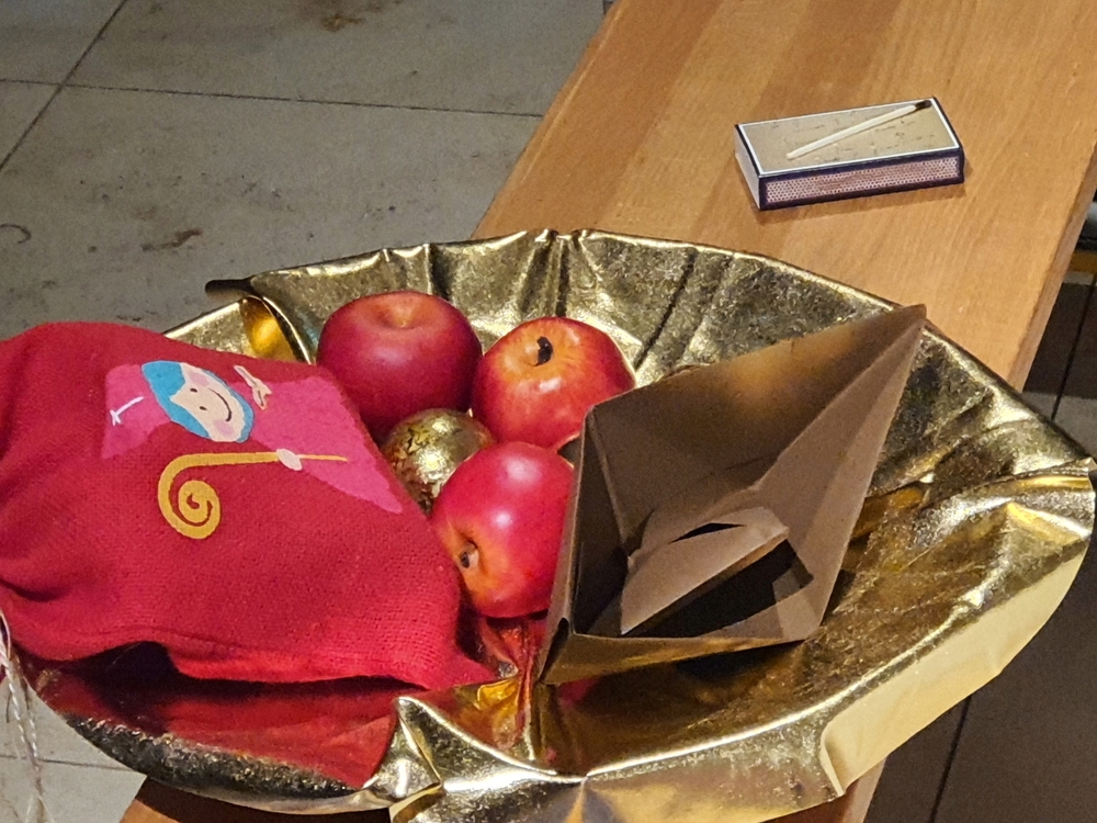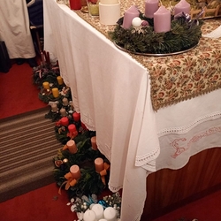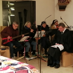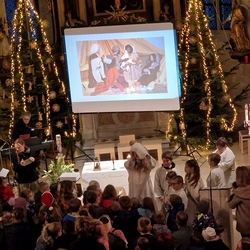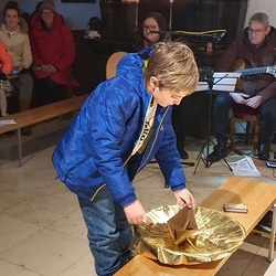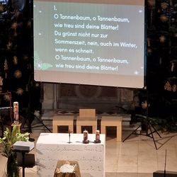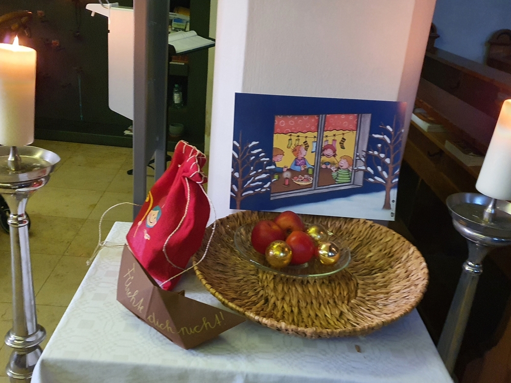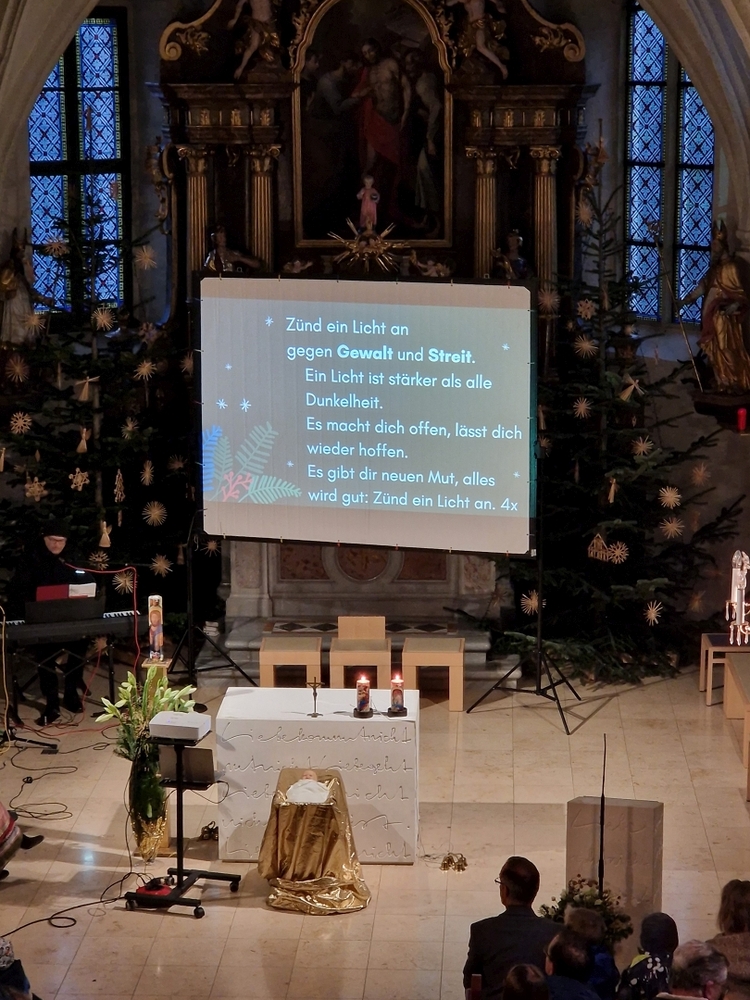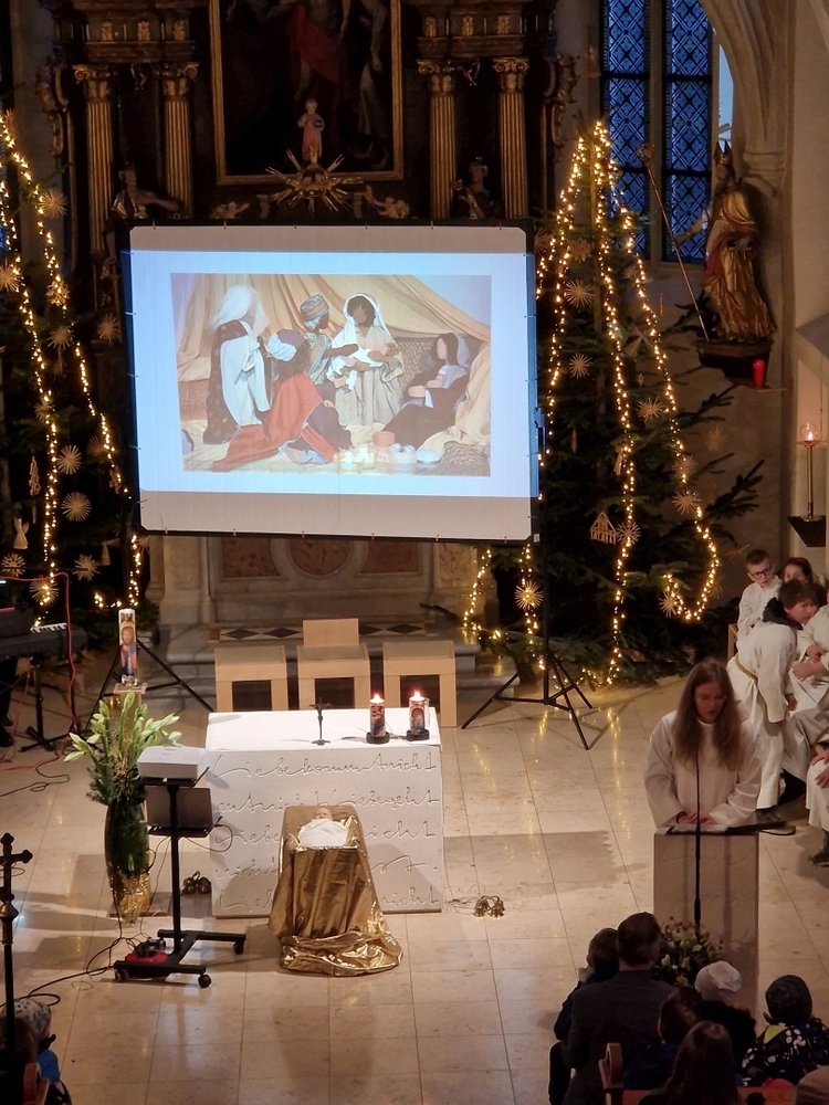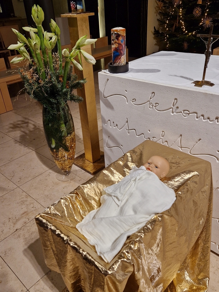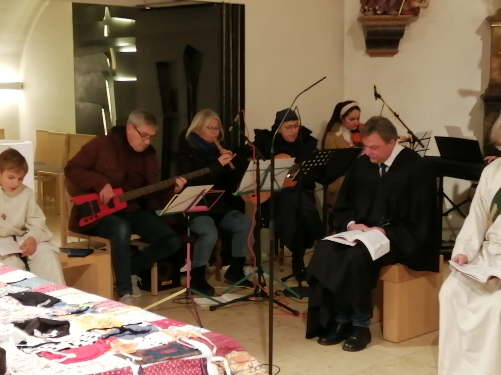 In seiner Predigt sprach Vikar Gerhard von Gott, der als kleines, hilfloses Kind zur Welt gekommen ist, in Armut und Bedürftigkeit. Eine mitgebrachte Windel symbolisiert dies. - Gott ist einer von uns, er kommt uns entgegen. Er ist ein Gott, an den wir uns anlehnen können. Er umarmt uns und stillt unser Verlangen nach Geborgenheit, Liebe und Frieden. …