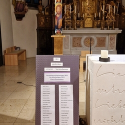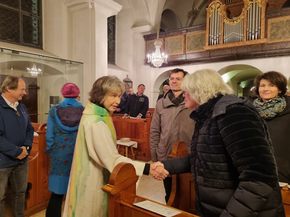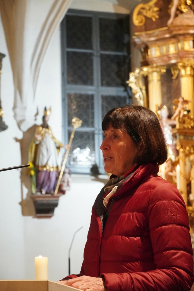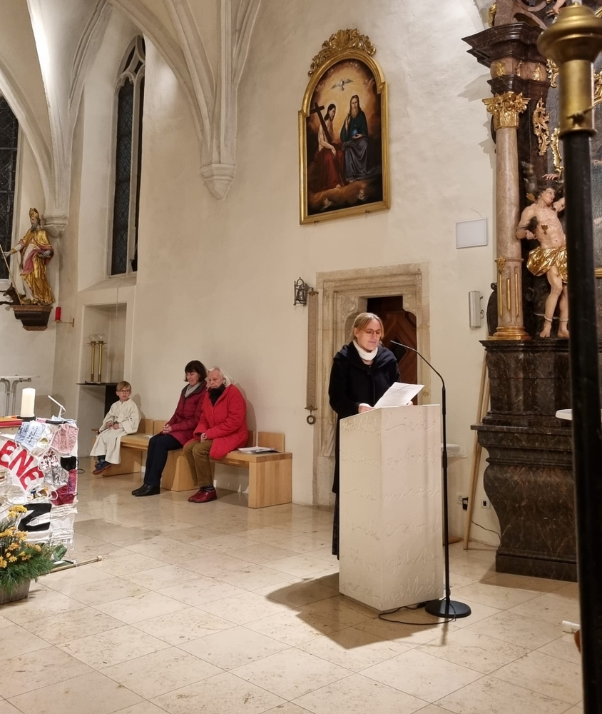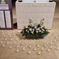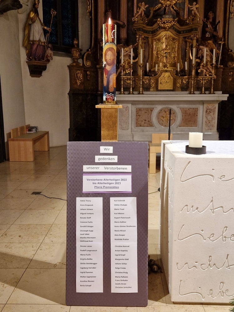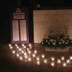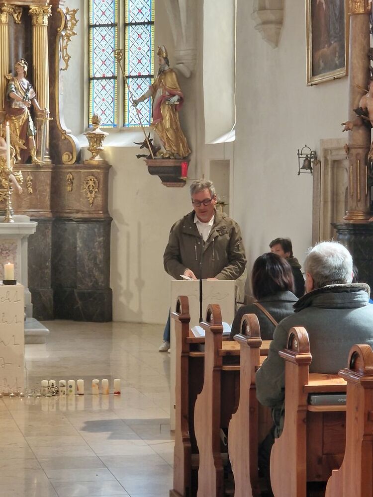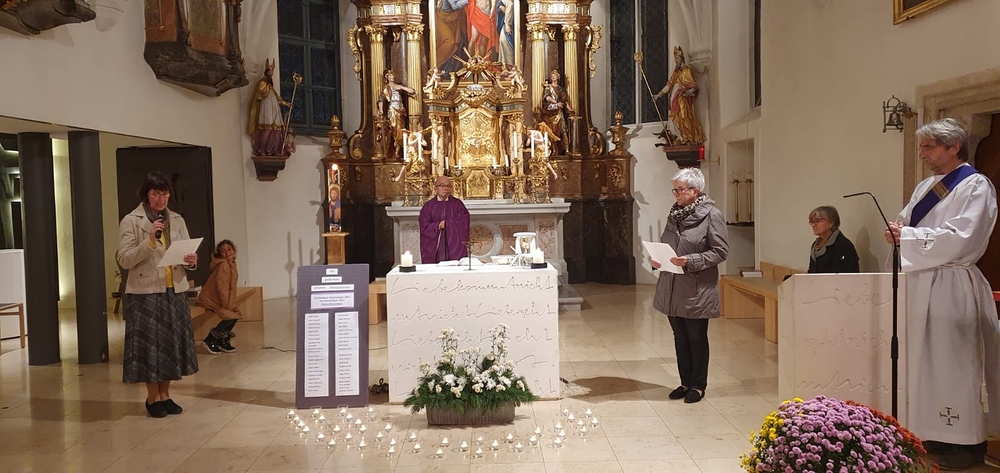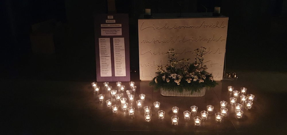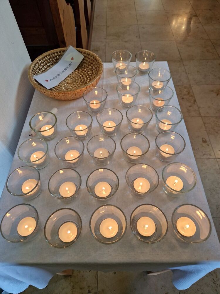 Noch einmal wurden – wie schon am Friedhof – die Namen der Verstorbenen von Allerheiligen 2022 bis Allerheiligen 2023 vorgelesen. 43 Teelichter wurden entzündet, eines davon für alle nicht namentlich genannten Verstorbenen.