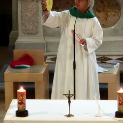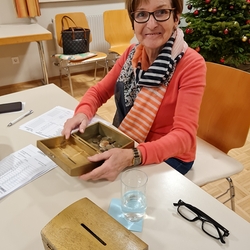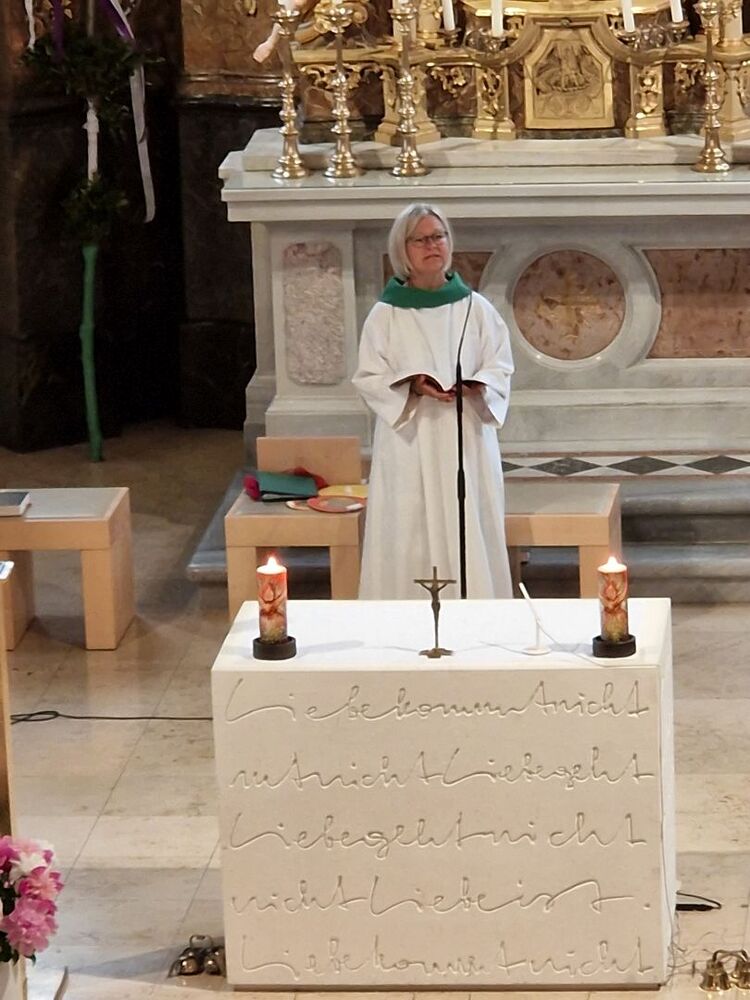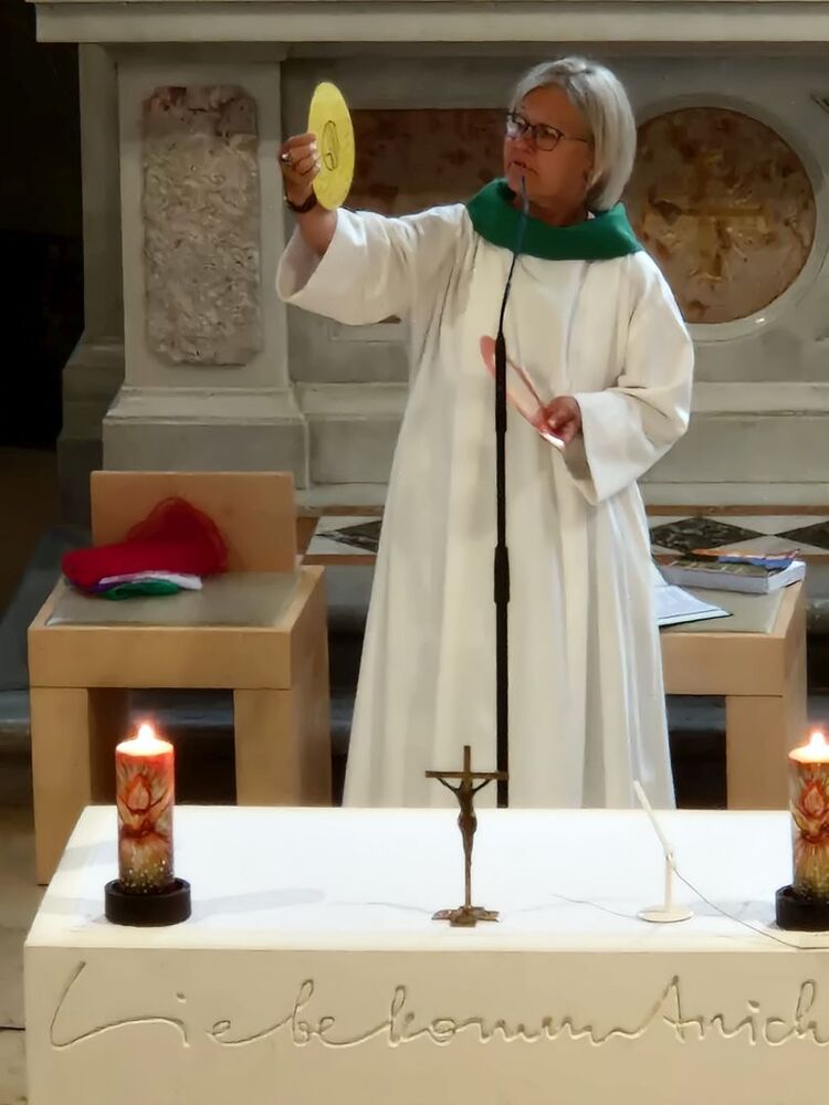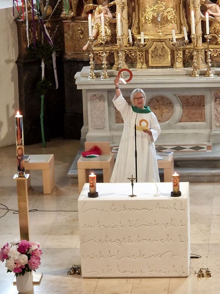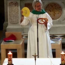 Sehr anschaulich erläuterte Helga mit einem Symbol das Wesen des dreieinen Gottes und brachte in der Predigt ihre Gedanken zur „Dreifaltigkeit“ zum Ausdruck: