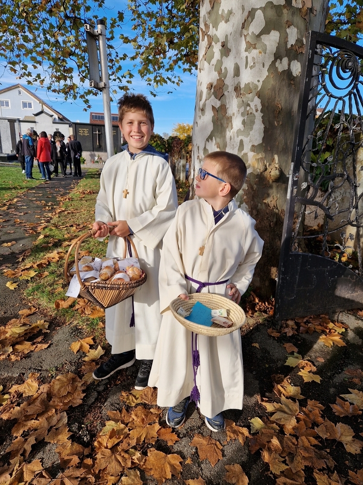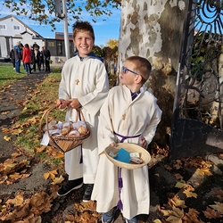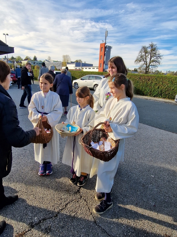 Auch die MINIS halfen mit und boten nach der Feier an den Ausgängen gegen eine freiwillige Spende ihre selbst gebackenen Allerheiligenstriezel an.