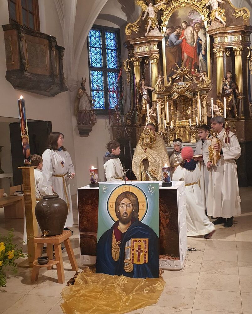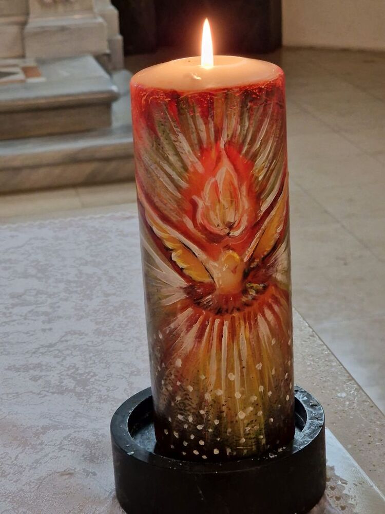 Diese Auferstehungsfreude erlebten wir mit ganzem Herzen am frühen Ostermorgen in unserer Pfarrkirche beim gemeinsamen Feiern. Symbol des auferstandenen Christus ist die Osterkerze, heuer gestaltet von Birgit Zepf. Das Licht dieser Kerze wird uns wieder das ganze Jahr hindurch an diese freudige Botschaft des Ostermorgens erinnern!