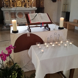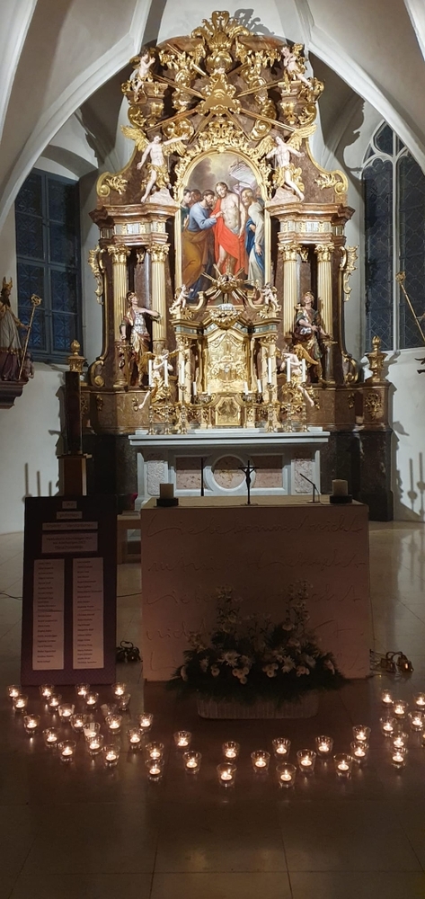 Das „Lichtermeer“ vor dem Altar drückt die Hoffnung aus, dass unsere lieben Verstorbenen nun im Lichte Gottes leben dürfen!