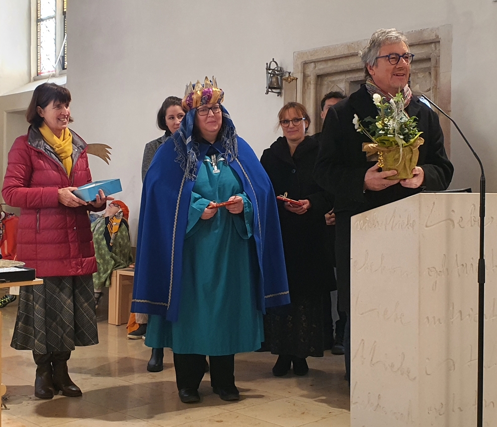 Vor dem Segen und dem königlichen Auszug sprach PGR-Vorsitzender Ernst Pock dem tollen Sternsinger-Organisationsteam unserer Pfarre den herzlichsten Dank aus, allen voran Franziska Zachenegger für ihren großartigen, unermüdlichen Einsatz und ihren engagierten Teammitgliedern Bernadette Latzka, Ulrike Nowak-Hölzer und Friedrich Stubenrauch. Zum Zeichen der Anerkennung wurden kleine Geschenke überreicht. Gedankt wurde auch Diakon Michi Zepf und Stefan Stampler an der Orgel.
