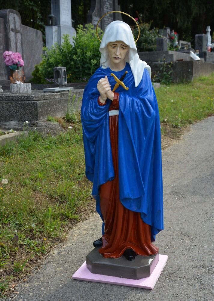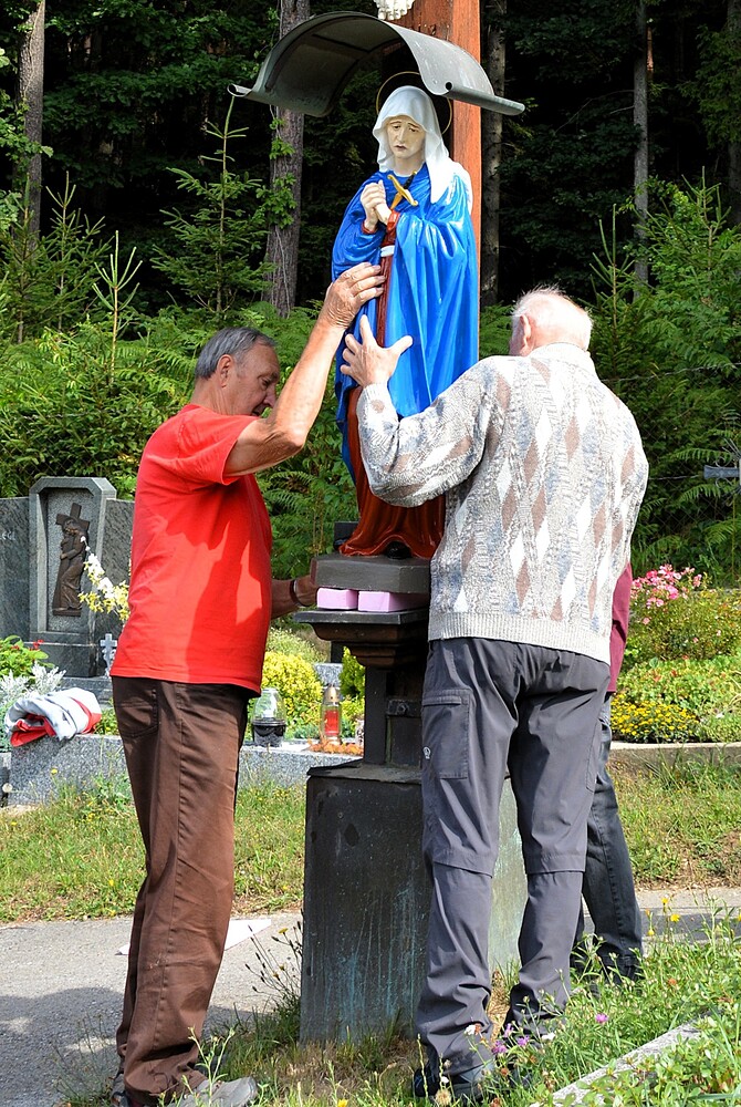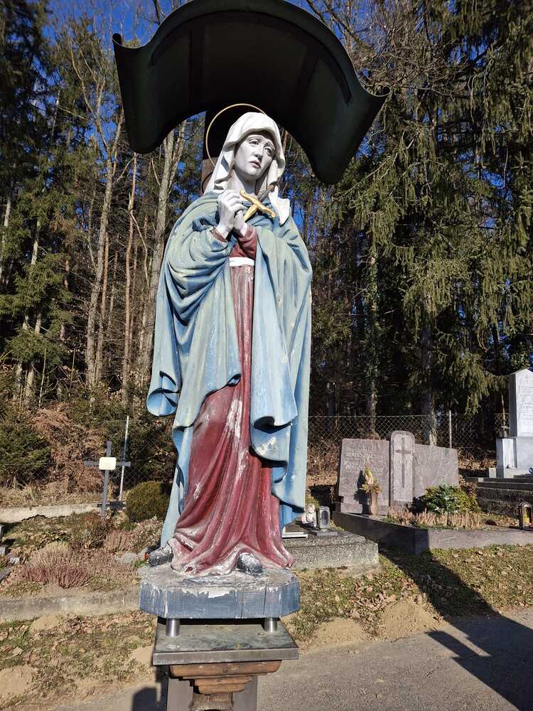 Die Statue am Friedhofeingang verschwand 2008 und konnte 2009 dank diverser Spendenaktivitäten der Bevölkerung neu angeschafft werden.