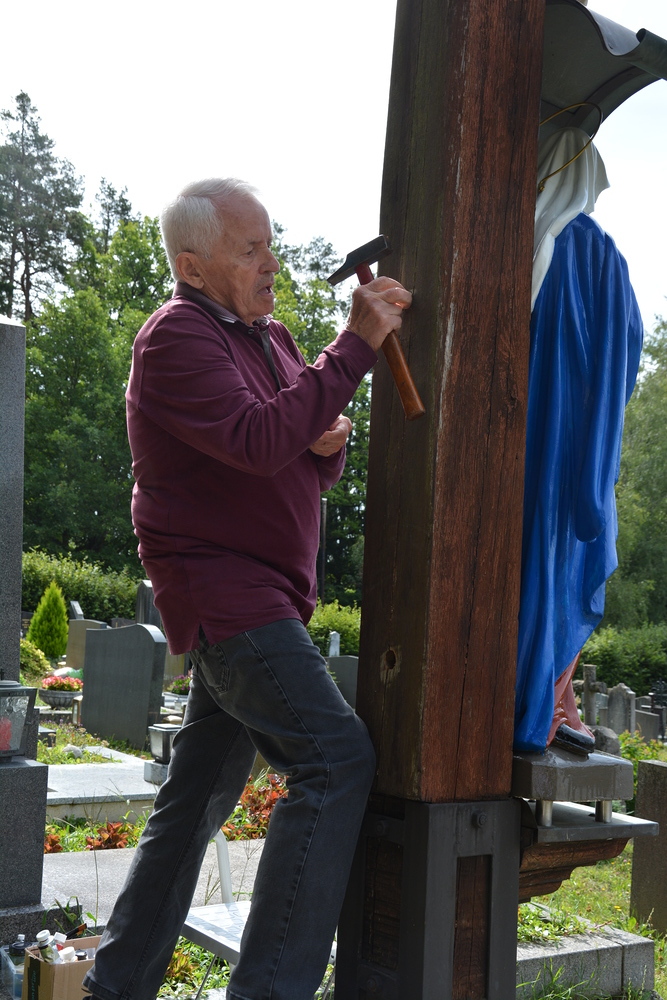 Ein Freund schenkte mir im Jahr 1990 das abgemorschte Kreuz, welches ich danach restaurierte. Zugleich wurde ein neues Dach angefertigt und eine Christusfigur geschnitzt.