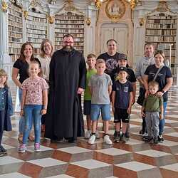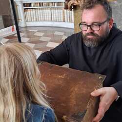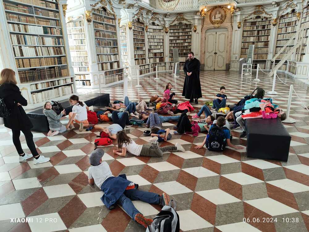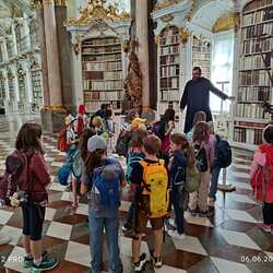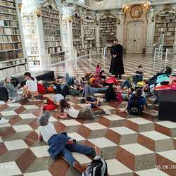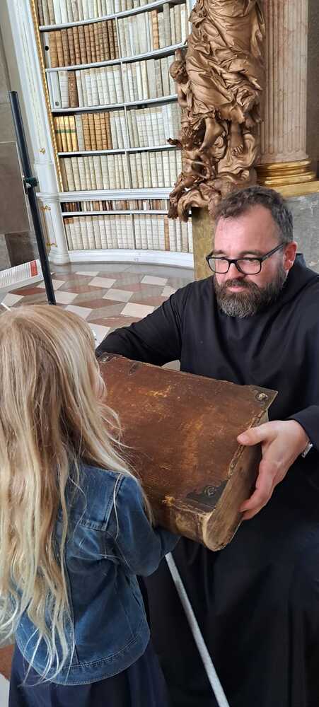P. Ulrich zeigte Ihnen die größte Stiftsbibliothek der Welt. Wir schauten uns 800 Jahre alte Bücher an....