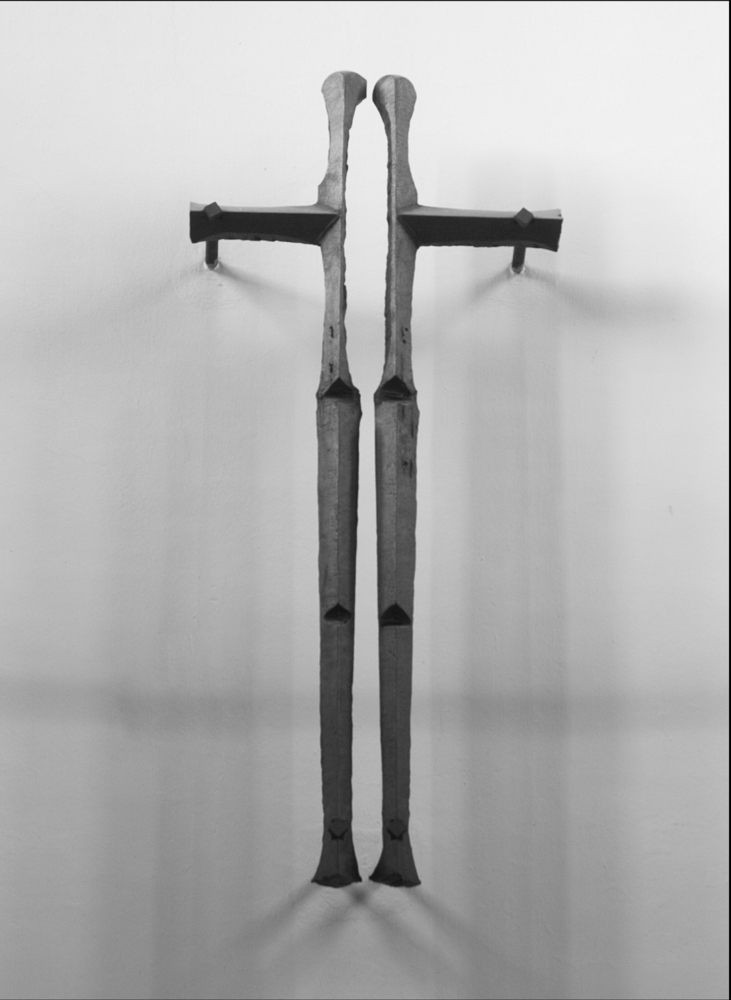 Der abstrakte Körper - der senkrechte Balken ist in zwei Stäbe geteilt - erinnert im unteren Teil an Gliedmaßen. Die Ränder des vergrößerten Leerraums im oberen Teil wirken wie aufgerissen (Leiden, Verwundung). Die Marter des Gekreuzigten wird nicht realistisch gezeigt, sondern im Zerbrechen und Auseinanderreißen angedeutet. Das Kreuz trägt keinen sichtbaren Leib, es veranlasst den Betenden, s e i n e n Christus hinzuzufügen.
